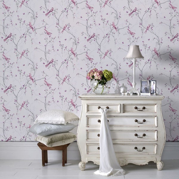 Die lilafarbene Tapete Songbird verleiht einer schlichten Farbpalette ein zartes, feminines Design. Das ineinander verwobene Muster aus Vögeln auf zarten Blütenzweigen und Schmetterlingen wird durch dezente Glitzer- und Glimmernuancen aufgewertet.