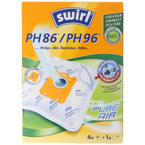 Swirl Staubsaugerbeutel PH86, PH96 für Philips, AEG, Dirt Devil, Electrolux, Hanseatic, PrivilegSwirl Staubsaugerbeutel PH 86 / PH 96 z. B. passend für: AEG ACS 1800 Classic Silencel, AEG AEO Essensio, AEQ 10, 12, 17, 20 ... Equipt, AEG APF Power Force, APF 6110, 6111, APF 6140, AEG AUS Ultra Silencer, AEG VX6, VX7, VX8, Philips FC 8446, FC 8452 PowerLife, Philips FC 8322 PowerLife, Philips FC 8371 Performer CompactOptimale Passform dank abgerundeter Ecken und mehr Sicherheit durch AntiBac System. Die Staubsaugerbeutel mit Dirtlock Staubverschluss und MicroPor Plus-Technologie.