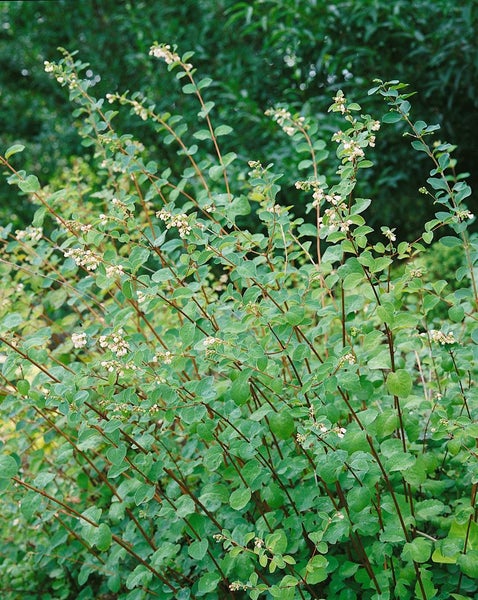 Symphoricarpos × doorenbosii ‘Amethyst’, die Schneebeere beziehungsweise Knallerbse ‘Amethyst’, ist ein attraktiver Zierstrauch, der mit seinem filigranen Blütenschmuck und den auffallend amethystfarbenen Beeren den Garten vom Sommer bis in den Winter hinein bereichert. Dieser Blütenstrauch zeigt im Frühsommer zarte, rosig-weiße Glöckchenblüten, die sich an dicht verzweigten, elegant bogig überhängenden Trieben präsentieren. Das ovale, frischgrüne Laub bildet einen schönen Kontrast und sorgt für eine gepflegte, gleichmäßige Optik im Beet. Ab Spätsommer entwickeln sich die namensgebenden violett-purpurnen Beeren, die lange haften und dem Gartenstrauch eine besondere Zierwirkung verleihen. ‘Amethyst’ wächst buschig, dicht und gut verzweigt, eignet sich daher hervorragend als Heckenpflanze für lockere, natürliche Sichtschutzstreifen, ebenso für Gruppenpflanzungen im Vorgarten oder als strukturgebende Solitärpflanze. In großen Gefäßen kann der robuste Strauch auch als Kübelpflanze auf Terrasse und Hof wirken, wo sein fruchtbetonter Winterschmuck zur Geltung kommt. Bevorzugt werden sonnige bis halbschattige Standorte; auch lichtschattige Lagen werden gut vertragen. Der Boden darf von sandig bis lehmig reichen, sollte durchlässig sein und gerne kalkhaltig, insgesamt ist die Sorte sehr anpassungsfähig. Ein rückschnittverträglicher, pflegeleichter Gartenstrauch, der im späten Winter oder zeitigen Frühjahr problemlos eingekürzt oder verjüngt wird, um eine kompakte, reich fruchtende Wuchsform zu fördern. Nach der Etablierung zeigt ‘Amethyst’ eine hohe Trockenheitstoleranz und überzeugt als zuverlässiger, vielseitig einsetzbarer Blüten- und Fruchtschmuck im Gartenjahr.