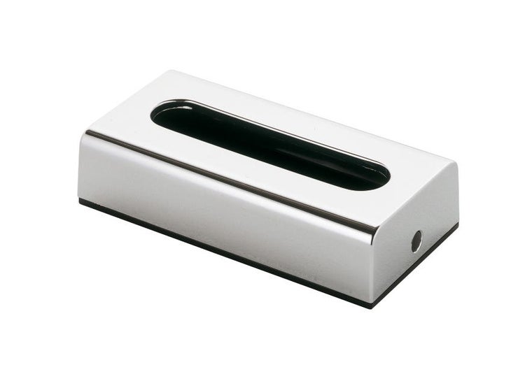 Rechteckiger Taschentuchhalter aus verchromtem thermoplastischem Harz mit einem Entnahmeschlitz von 20,5 x 4,2 cm. Er kann Taschentücher mit einer maximalen Größe von 24,5 x 11,5 cm aufnehmen. Durch die aufrechte Position kann dieses Accessoire auf jeder Oberfläche im Bad und darüber hinaus platziert werden.