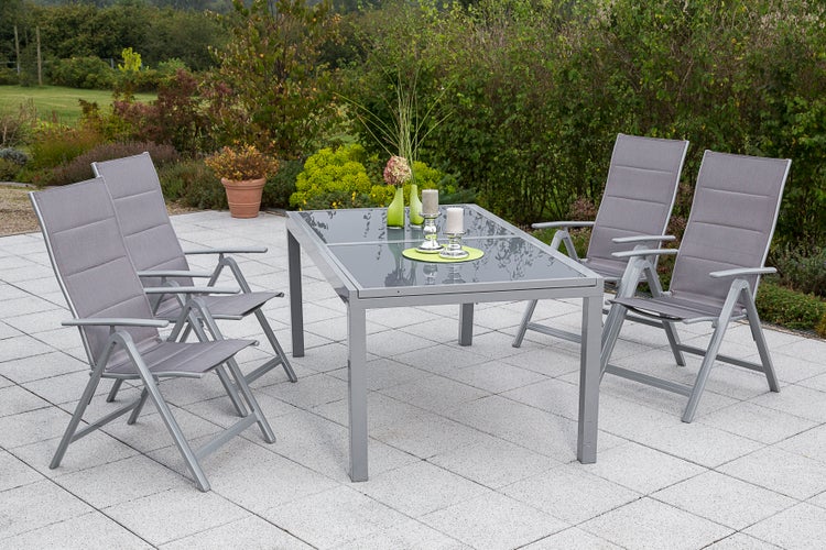 Die Taviano Serie ist eine moderne Gruppe für Ihren Garten oder Ihre Terrasse. Der Sessel besticht nicht nur durch seine attraktive diamantbraune Textilbespannung, sondern auch durch die bequeme gepolsterte Rücken- und Sitzfläche. Genießen Sie optimale Entspannung dank der 5-fach verstellbaren Rückenlehne. Der Ausziehtisch mit den Grundmaßen von 160 x 90 cm lässt sich bei Bedarf auf eine Länge von 220 cm ausziehen und bietet ausreichend Platz für bis zu sechs Personen und überzeugt mit seiner grauen Sicherheitsglasplatte.