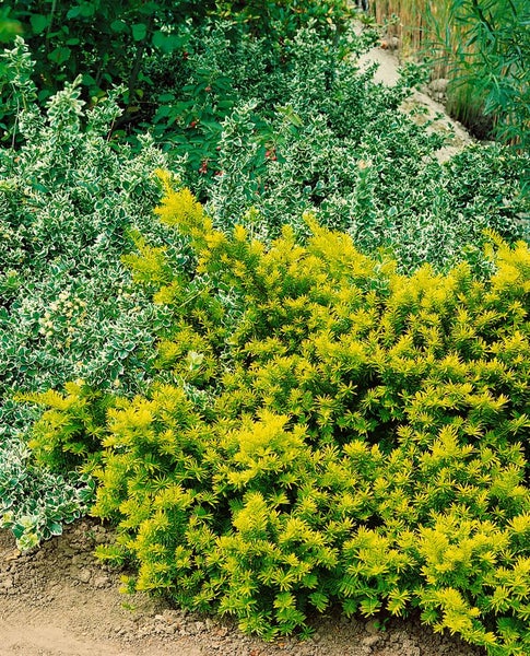 Taxus baccata Washingtonii, die goldgelbe Form der Gewöhnlichen Eibe, ist ein immergrünes Nadelgehölz mit besonderem Zierwert und klassischem Charakter. Die Sorte besticht durch leuchtend goldgelbe Austriebe, die im Jahreslauf zu sattem Dunkelgrün nachdunkeln und so ganzjährig lebendige Farbkontraste im Garten schaffen. Mit ihrem schlanken, aufrecht-säulenförmigen Wuchs eignet sich diese Eibe hervorragend als strukturgebendes Ziergehölz, als formaler Gartenstrauch für den Formschnitt oder als elegante Heckenpflanze. Die Nadeln sind weich, dicht stehend und sorgen für ein gepflegtes, edles Erscheinungsbild; im Frühjahr erscheinen unscheinbare Blüten, bei weiblichen Pflanzen folgen im Spätsommer dekorative rote Scheinbeeren, die die Wirkung zusätzlich unterstreichen. Als Solitär im Vorgarten, in der Gruppe als Rahmenpflanzung oder als Kübelpflanze auf Terrasse und Eingang wirkt Taxus baccata Washingtonii besonders harmonisch, da die goldenen Spitzen Lichtblicke setzen und Architektur sowie Beetgestaltung betonen. Am besten gedeiht sie an sonnigen bis halbschattigen Standorten; je mehr Sonne, desto intensiver die Goldfärbung, zugleich ist sie bemerkenswert schattenverträglich. Der Boden sollte durchlässig, humos und mäßig frisch sein, gern mit kalkhaltiger Note; Staunässe ist zu vermeiden. Die Sorte wächst langsam bis mittelstark, bleibt formstabil und ist hervorragend schnittverträglich, wodurch klare Konturen und präzise Formschnitte leicht gelingen. Robust, winterhart und windunempfindlich, ist diese Eibe ein vielseitiges Gehölz für formale Gärten, moderne Architekturbeete, Abgrenzungen und dauerhafte Strukturpflanzungen mit hohem gestalterischem Wert.