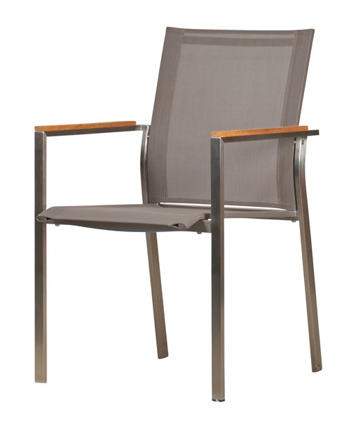 Die Brücke zwischen klassisch-bewährtem Design und moderner Optik schlägt dieser Teak Edelstahl Gartenstuhl gekonnt. Dank der zeitgemäßen Materialien und Farben passt er hervorragend in moderne Gärten. Das Gestell des Edelstahl Gartenstuhls besteht aus gebürstetem Edelstahl, welcher absolut witterungsresistent und rostfrei ist. Derweil sind Sitzfläche und Rückenlehne mit einem strapazierfähigen Kunsttextil bespannt. Dieses gibt leicht nach, ohne auszuleiern, sodass Sie von einem herausragenden Sitzkomfort profitieren. Die feinen Teak-Applikationen an den Armlehnen stellen einen tollen Übergang zu Gartentischen aus Teakholz her. Ein schöner Nebeneffekt ist, dass Sie sich nicht an den vom Sonnenlicht aufgeheizten Armlehnen verbrennen werden, da Teakholz kaum Wärme leitet. Hinzu kommt, dass unsere Teak Edelstahl Gartenmöbel geschickt ineinander stapelbar und somit platzsparend zu verstauen sind. Trotz ihrer robusten Konstruktion müssen Sie sich keine Gedanken um verkratzte Böden machen, da die Stuhlbeine mit Kunststoffgleitern versehen sind. Genießen Sie unbeschwerte Freiluftmomente!