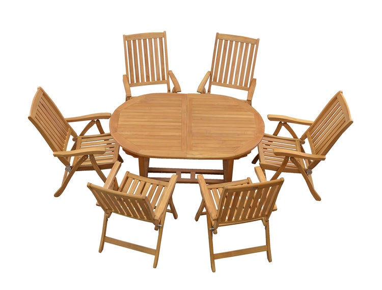 Teak Sitzgruppe 6 Hochlehner klappbar 1 Tisch oval ausziehbar 150 x 100 cm im Set
