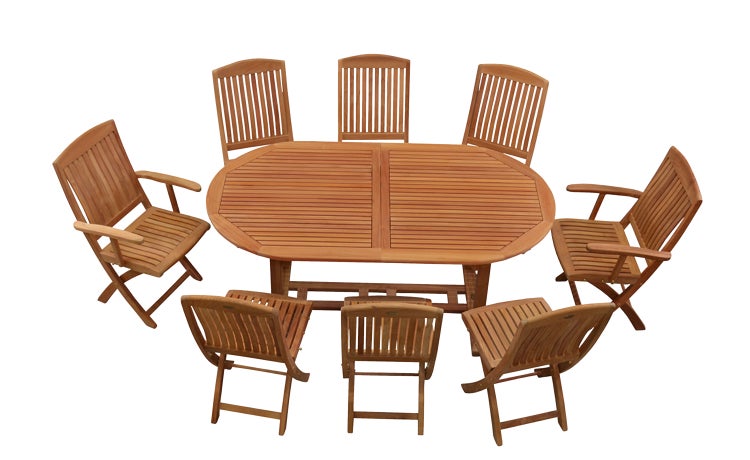 Mit dieser neunteiligen Premium Teak Essgruppe gönnen Sie sich etwas ganz Besonderes. Die Komposition aus sechs Klappstühlen, zwei Klappstühlen mit Armlehnen und einem Tisch mit Ausziehfunktion ist praktisch und komfortabel zugleich. Die Teakholz Sitzgruppe eignet sich insbesondere für Gärten, in denen nicht unbegrenzter Platz vorhanden ist, aber gleichzeitig auch nicht auf Premium Qualität und Komfort verzichtet werden soll. Die Teak Stühle sind klappbar und platzsparend verstaubar. Kombiniert mit dem ovalen Auszugstisch, der durch seine besondere Bauweise und die erweiterbare Tischplatte überzeugt, steht dem nächsten Grillabend nichts mehr im Wege. Aufgrund seiner Eigenschaften ist Teakholz absolut wetterbeständig und trotzt selbst Schnee und Frost. Das Teak-Set glänzen zudem durch zeitloses Design und ergonomisch geformten Holzleisten im Sitz- und Rückenbereich der Gartenstühle. Selbstverständlich sind alle Messingschrauben und -beschläge rostfrei. Mit dieser Luxus Outdoor-Sitzgruppe aus Teakholz genießen sorglose Stunden unter freiem Himmel.