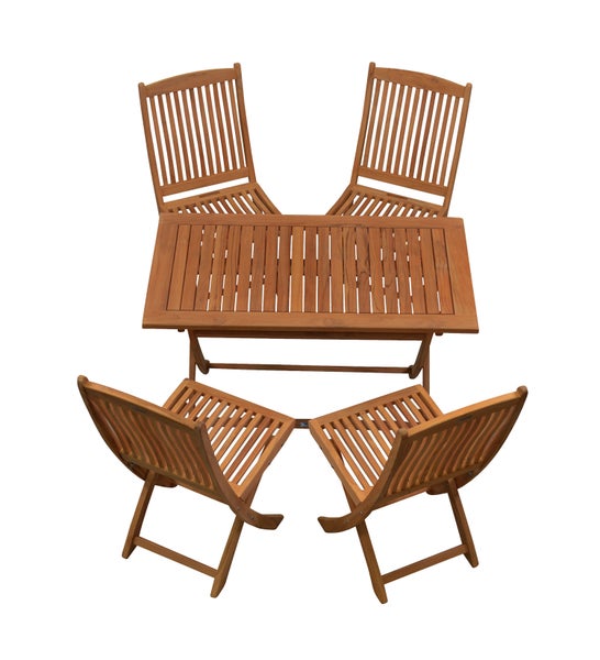 Mit dieser fünfteilige Teak Essgruppe gönnen Sie sich etwas ganz Besonderes. Die Komposition aus vier Teak-Klappstühlen und einem Teak Klapptisch ist praktisch und komfortabel zugleich. Die Teakholz Sitzgruppe eignet sich insbesondere für Balkone, auf denen nicht unbegrenzter Platz vorhanden ist, aber gleichzeitig auch nicht auf solide Qualität und Komfort verzichtet werden soll. Sowohl der Teaktisch als auch die Teak Stühle sind im Handumdrehen zusammenklappbar. Aufgrund seiner Eigenschaften ist Teakholz absolut wetterbeständig und trotzt selbst Schnee und Frost. Der schmale Tisch ist auf Balkonen oftmals von großem Vorteil. Die Faltstühle sind mit einem praktischen Griff in der Sitzfläche sowie einem Klappschutz versehen und wegen ihrer tiefen Sitzfläche auch bei größere Personen beliebt. Neben dem wetterfesten Holz finden Sie rostfreien Edelstahlschrauben und -beschlägen bei allen Gartenmöbeln aus dem Set. Mit dieser Outdoor-Sitzgruppe aus Teakholz profitieren Sie von einem einzigartigen Preis-Leistungs-Verhältnisses und genießen sorglose Stunden unter freiem Himmel.