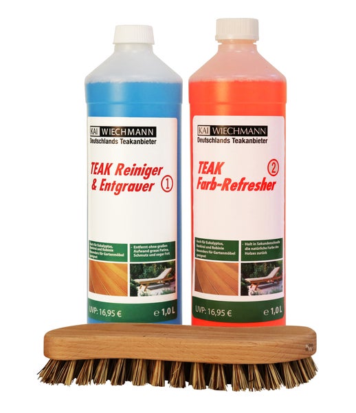 - Lieferumfang: 1 Flasche Teak Reiniger & Entgrauer = 1 Liter | 1 Flasche Farb-Refresher = 1 Liter | 1 Wurzelholzbürst