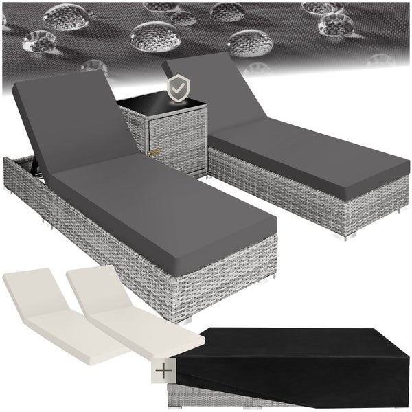 tectake 2er Set Sonnenliegen Aluminium Rattan mit Tisch Schutzabdeckung Polster Beige/Grau verstellbar light grey