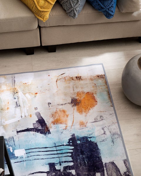 Rechteckiger Teppich mit abstraktem Muster. Ein geschmackvoller Teppich in Gemälde Optik der Ihr Herz um etliche Takte höher schlagen lässt. Mit seinem fantasievollen Muster wird dieser rechteckige Kurzflorteppich in allen Einrichtungsstilen zu einem ausdrucksstarken Hingucker. Dank des strapazierfähigen Materials aus Polyester-Filz ist er nicht nur robust sondern auch pflegeleicht. Details: Typ Kurzflor. Farbe: Bunt. Farbton: Hellblau. Material: Stoff. Material: Polyester. Rückseitenmaterial: Polyester. Zusammenstellung: 100% Polyester. Form: Rechteckig. Rutschfeste Unterseite: Ja. Stoffgewicht: 200 g/m2. Muster: Abstraktes Muster. Herstellungsmethode: Maschinengewebt. Abmessungen: Florhöhe: 0.5 cm. Breite: 80 cm. Länge: 150 cm. Gewicht: 1 kg. .Sie kaufen: 1 x Teppich. Produktvorteile: Besonders sicher dank rutschfester Unterseite, Trendy Farben und Design, Gut kombinierbar mit vielen Einrichtungsstilen, Nur für Innenräume geeignet, Pflegeleichtes und strapazierfähiges Material. Montage: Benötigt keine Montage. Zusatzinformationen: Der Artikel benötigt einige Zeit, bis er seinen ursprünglichen Zustand erreicht hat – daher sollte er so schnell wie möglich ausgerollt werden und innerhalb von 72 Stunden seine vollständige Größe wieder erreichen. Für einen optimalen Effekt sollte man die Teppichkanten mit schweren Gegenständen fixieren. Pflegeanleitung: 1.Staubsaugen einmal pro Woche ist ausreichend, um den Teppich sauber und gepflegt zu halten. Wir empfehlen dazu einen Staubsauger mit flacher, weicher Bürste und die Einstellung von mittlerer Saugleistung. Saugen Sie Ihren Teppich immer in Florrichtung ab. 2.Soweit das Format dies zulässt, drehen Sie den Teppich alle sechs Monate um 180 Grad. So erhalten sie eine gleichmäßige Abnutzung und vermeiden Sie Verbleichen der Farben durch Sonneneinstrahlung. 3.Entfernen Sie Flecken umgehend. Flüssigkeiten werden mit einem saugfähigen, nicht färbenden Baumwolltuch aufgenommen. Arbeiten Sie vom Rand nach innen und verreiben Sie den Fleck nicht. 4.Bei festem Schmutz können Sie die losen Schmutzteile vorsichtig abkratzen. Danach wird die Stelle mit klarem, lauwarmem Wasser abgetupft. Benutzen Sie dazu ein sauberes nicht färbendes Baumwolltuch sowie einen Fleckentferner speziell für Teppiche. Bitte befeuchten Sie den Teppich dabei nicht zu stark. Falls der Fleck hartnäckig sein sollte, wenden Sie sich bitte an ein Fachgeschäft für Teppichreinigungen. 5.Es wird empfohlen den ausgepackten Teppich mindestens ein paar Stunden (am besten ein oder zwei Tage) zu lüften. Dies ermöglicht den natürlichen Geruch des Materials, aus dem das Produkt gefertigt wurde, zu mildern.