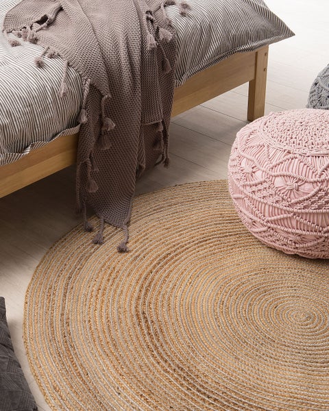 Moderner, runder Boho-Teppich aus Jute mit Glanzgarn. Dieser Teppich überzeugt mit seiner natürlichen Schönheit, Langlebigkeit und einzigartigen Verarbeitung. So bildet er eine ideale Fußunterlage unter dem Schreibtisch sowie vor dem Bett oder Sofa. Er besteht aus umweltfreundlicher Jute, die für Allergiker geeignet ist und durch haltbares synthetisches Material verstärkt wird. Der Kunststoffgarn kreiert eine Spiralform, die diesem Modell eine leichte Glanz-Optik verleiht und damit einen neuen Akzent in Ihren Räumen setzt. Details: Typ Geflochtener Teppich. Stil: Boho. Farbe: Beige. Material: Stoff. Material: Jute. Zusätzliches Material: Kunststoff. Form: Rund. Rutschfeste Unterseite: Nein. Stoffgewicht: 2200 g/m2. Muster: Ohne Muster. Herstellungsmethode: Maschinengewebt. Abmessungen: Florhöhe: 0.6 cm. Breite: 140 cm. Länge: 140 cm. Gewicht: 3 kg. .Sie kaufen: 1 x Teppich. Produktvorteile: Zeitloses Design, Erzeugt Wohlfühlcharakter in jedem Raum, Passt ausgezeichnet zu vielen Einrichtungsstilen, Besonders pflegeleicht und langlebig, Natürliche Materialien. Montage: Benötigt keine Montage. Zusatzinformationen: Der Artikel könnte Haare verlieren. Dies ist ein normaler Vorgang und stellt keinen Qualitätsmangel des Produkts dar. Da der Teppich handgewebt ist, können kleine Farb-, Muster-, bzw. Grössendifferenzen auftreten. Diese Unterschiede stellen jedoch keinen Produktfehler dar. Der Artikel benötigt einige Zeit, bis er seinen ursprünglichen Zustand erreicht hat – daher sollte er so schnell wie möglich ausgerollt werden und innerhalb von 72 Stunden seine vollständige Größe wieder erreichen. Für einen optimalen Effekt sollte man die Teppichkanten mit schweren Gegenständen fixieren. Bitte beachten Sie, dass jedes Modell leicht von dem im Bild dargestellten abweichen kann. Die Anordnung der Farben und Muster kann unterschiedlich ausfallen und wird nicht als Produktfehler, sondern als Merkmal betrachtet Pflegeanleitung: 1.Staubsaugen einmal pro Woche ist ausreichend, um den Teppich sauber und gepflegt zu halten. Wir empfehlen dazu einen Staubsauger mit flacher, weicher Bürste und die Einstellung von mittlerer Saugleistung. Saugen Sie Ihren Teppich immer in Florrichtung ab. 2.Soweit das Format dies zulässt, drehen Sie den Teppich alle sechs Monate um 180 Grad. So erhalten sie eine gleichmäßige Abnutzung und vermeiden Sie Verbleichen der Farben durch Sonneneinstrahlung. 3.Entfernen Sie Flecken umgehend. Flüssigkeiten werden mit einem saugfähigen, nicht färbenden Baumwolltuch aufgenommen. Arbeiten Sie vom Rand nach innen und verreiben Sie den Fleck nicht. 4.Bei festem Schmutz können Sie die losen Schmutzteile vorsichtig abkratzen. Danach wird die Stelle mit klarem, lauwarmem Wasser abgetupft. Benutzen Sie dazu ein sauberes nicht färbendes Baumwolltuch sowie einen Fleckentferner speziell für Teppiche. Bitte befeuchten Sie den Teppich dabei nicht zu stark. Falls der Fleck hartnäckig sein sollte, wenden Sie sich bitte an ein Fachgeschäft für Teppichreinigungen. 5.Es wird empfohlen den ausgepackten Teppich mindestens ein paar Stunden (am besten ein oder zwei Tage) zu lüften. Dies ermöglicht den natürlichen Geruch des Materials, aus dem das Produkt gefertigt wurde, zu mildern.