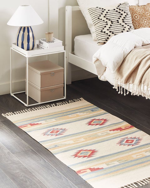 Handgewebter, rechteckiger Baumwollteppich mit stilvollem Muster und hellen Fransen. Dieser flach gewebter Vorleger besteht aus hochqualitativen Baumwollfasern und bezaubert mit seiner Einzigartigkeit. Er ist mithilfe einer traditionellen Handwebtechnik gefertigt worden und erhält dadurch einen originellen Look. Während dieses Prozesses wird sein farbenprächtiges Motiv auf beide Seiten des Kelims aufgetragen, so können Sie ihn auf jeder dieser Seiten nutzen. Die zusätzlichen Fransen an den Teppichseiten verleihen ihm einen gemütlichen Touch und passen perfekt zu dem farbenfrohen Muster. Die natürlichen Materialien machen das Modell sehr ausdauerfähig und langlebig, sodass man den Kurzhaar-Teppich sowohl in leicht als auch in stark frequentierten Bereichen platzieren kann. Details: Typ Kelim. Farbe: Beige. Material: Stoff. Material: Baumwolle. Zusammenstellung: 100% Baumwolle. Form: Rechteckig. Rutschfeste Unterseite: Nein. Stoffgewicht: 900 g/m2. Muster: Geometrisches Muster. Herstellungsmethode: Handgewebt. Abmessungen: Florhöhe: 0.5 cm. Breite: 80 cm. Länge: 150 cm. Gewicht: 1.1 kg. .Sie kaufen: 1 x Teppich. Produktvorteile: Gut kombinierbar mit vielen Einrichtungsstilen, Wunderbar geeignet für Schlaf- und Wohnbereich, Warme, elegante Farbe, Handgefertigte Präzision, Weiches Gewebe mit angenehmer Haptik. Montage: Benötigt keine Montage. Zusatzinformationen: Da der Teppich handgewebt ist, können kleine Farb-, Muster-, bzw. Grössendifferenzen auftreten. Diese Unterschiede stellen jedoch keinen Produktfehler dar. Der Artikel benötigt einige Zeit, bis er seinen ursprünglichen Zustand erreicht hat – daher sollte er so schnell wie möglich ausgerollt werden und innerhalb von 72 Stunden seine vollständige Größe wieder erreichen. Für einen optimalen Effekt sollte man die Teppichkanten mit schweren Gegenständen fixieren. Pflegeanleitung: 1.Staubsaugen einmal pro Woche ist ausreichend, um den Teppich sauber und gepflegt zu halten. Wir empfehlen dazu einen Staubsauger mit flacher, weicher Bürste und die Einstellung von mittlerer Saugleistung. Saugen Sie Ihren Teppich immer in Florrichtung ab. 2.Soweit das Format dies zulässt, drehen Sie den Teppich alle sechs Monate um 180 Grad. So erhalten sie eine gleichmäßige Abnutzung und vermeiden Sie Verbleichen der Farben durch Sonneneinstrahlung. 3.Entfernen Sie Flecken umgehend. Flüssigkeiten werden mit einem saugfähigen, nicht färbenden Baumwolltuch aufgenommen. Arbeiten Sie vom Rand nach innen und verreiben Sie den Fleck nicht. 4.Bei festem Schmutz können Sie die losen Schmutzteile vorsichtig abkratzen. Danach wird die Stelle mit klarem, lauwarmem Wasser abgetupft. Benutzen Sie dazu ein sauberes nicht färbendes Baumwolltuch sowie einen Fleckentferner speziell für Teppiche. Bitte befeuchten Sie den Teppich dabei nicht zu stark. Falls der Fleck hartnäckig sein sollte, wenden Sie sich bitte an ein Fachgeschäft für Teppichreinigungen. 5.Es wird empfohlen den ausgepackten Teppich mindestens ein paar Stunden (am besten ein oder zwei Tage) zu lüften. Dies ermöglicht den natürlichen Geruch des Materials, aus dem das Produkt gefertigt wurde, zu mildern.