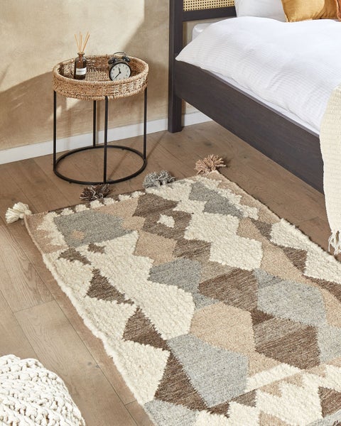 Handgewebter, rechteckiger Wollteppich mit geometrischem Muster und Quasten. Mit diesem Kelim bringen Sie einen gemütlichen Boho-Look in Ihre 4 Wände. Er besteht aus natürlicher Wolle und hochwertigen Baumwollfasern, die zusammen für eine anhaltende Qualität und Robustheit des Vorlegers sorgen. Wegen dieser Eigenschaften eignet sich dieser Kurzhaarteppich besonders für stark frequentierte Räume, wie Wohn-, Schlaf- oder Eingangsbereiche. Da das Modell von Hand gefertigt wird, können Sie mit einem Teppich rechnen, der mit einer einzigartigen Schönheit punktet. Details: Typ Kelim. Stil: Boho. Farbe: Bunt. Material: Stoff. Material: Wolle. Zusätzliches Material: Baumwolle. Zusammenstellung: 85% Wolle. Form: Rechteckig. Rutschfeste Unterseite: Nein. Stoffgewicht: 1500 g/m2. Muster: Geometrisches Muster. Geeignet für Fußbodenheizung: Ja. Herstellungsmethode: Handgewebt. Abmessungen: Florhöhe: 1 cm. Breite: 80 cm. Länge: 150 cm. Gewicht: 2 kg. .Sie kaufen: 1 x Teppich. Produktvorteile: Geeignet für Fussbodenheizung, Ein einzigartiger Hingucker, Traditionelles Design mit moderner Note, Handgefertigte Präzision, Hochwertiges Material. Montage: Benötigt keine Montage. Zusatzinformationen: Der Artikel benötigt einige Zeit, bis er seinen ursprünglichen Zustand erreicht hat – daher sollte er so schnell wie möglich ausgerollt werden und innerhalb von 72 Stunden seine vollständige Größe wieder erreichen. Für einen optimalen Effekt sollte man die Teppichkanten mit schweren Gegenständen fixieren. Jeder Artikel ist ein handgefertigtes Unikat; Farbschattierung und Muster können daher vom Foto abweichen. Pflegeanleitung: Wolle: 1.Soweit das Format dies zulässt, drehen Sie den Teppich alle sechs Monate um 180 Grad. So erhalten sie eine gleichmäßige Abnutzung und vermeiden Sie Verbleichen der Farben durch Sonneneinstrahlung. 2.Bei festem Schmutz können Sie die losen Schmutzteile vorsichtig abkratzen. Danach wird die Stelle mit klarem, lauwarmem Wasser abgetupft. Benutzen Sie dazu ein sauberes nicht färbendes Baumwolltuch sowie einen Fleckentferner speziell für Teppiche. Bitte befeuchten Sie den Teppich dabei nicht zu stark. Falls der Fleck hartnäckig sein sollte, wenden Sie sich bitte an ein Fachgeschäft für Teppichreinigungen. 3.Staubsaugen einmal pro Woche ist ausreichend, um den Teppich sauber und gepflegt zu halten. Wir empfehlen dazu einen Staubsauger mit flacher, weicher Bürste und die Einstellung von mittlerer Saugleistung. Saugen Sie Ihren Teppich immer in Florrichtung ab. 4.Es wird empfohlen den ausgepackten Teppich mindestens ein paar Stunden (am besten ein oder zwei Tage) zu lüften. Dies ermöglicht den natürlichen Geruch des Materials, aus dem das Produkt gefertigt wurde, zu mildern, 5.Entfernen Sie Flecken umgehend. Flüssigkeiten werden mit einem saugfähigen, nicht färbenden Baumwolltuch aufgenommen. Arbeiten Sie vom Rand nach innen und verreiben Sie den Fleck nicht.