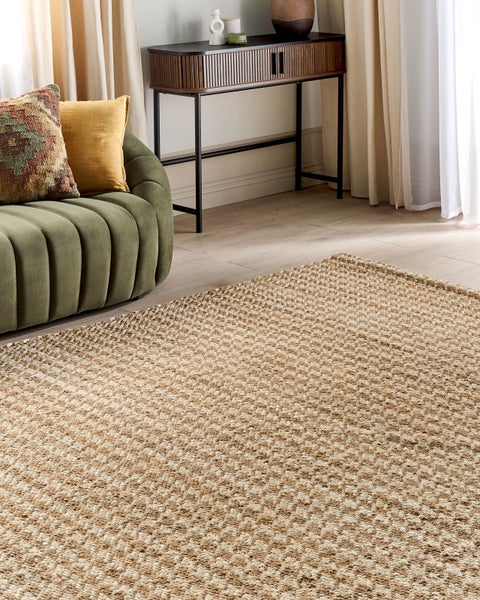 Rechteckiger, breiter Juteteppich mit Hahnentritt-Design. Dieser Wohnzimmerteppich ist die perfekte Verbindung von einem modernen Design und dem zeitlosen Boho-Stil. Der gesamte Teppich besteht aus hochwertigen Jutefasern, die sich nicht nur angenehm weich unter den Füßen anfühlen, sondern auch sehr langlebig und strapazierfähig sind. Dank dieser vorteilhaften Eigenschaften ist er sowohl für leicht als auch stark frequentierte Wohnbereiche geeignet. Dabei ist er in klassischen, hellen Jute-Farbtönen gehalten und mit einem trendigen Hahnentrittmuster versehen, das jeden Blick auf den Teppich lenkt. Dank seiner Größe kann er in vielen Räumen verwendet werden, vom Wohnzimmer bis zum Schlafzimmer oder Home-Office, und bringt einen frischen, gemütlichen Look mit sich. Details: Typ Kurzflor. Farbe: Beige. Material: Stoff. Material: Jute. Zusammenstellung: 100% Jute. Form: Rechteckig. Rutschfeste Unterseite: Nein. Stoffgewicht: 3500-3600 g/m2. Muster: Kariertes Muster. Herstellungsmethode: Handgewebt. Abmessungen: Florhöhe: 1 cm. Breite: 160 cm. Länge: 230 cm. Gewicht: 7 kg. .Sie kaufen: 1 x Teppich. Produktvorteile: Geeignet für Fussbodenheizung, Herrlich weich, Besonders pflegeleicht und langlebig, Handgefertigte Präzision, Natürliche Materialien. Montage: Benötigt keine Montage. Zusatzinformationen: Da der Teppich handgewebt ist, können kleine Farb-, Muster-, bzw. Grössendifferenzen auftreten. Diese Unterschiede stellen jedoch keinen Produktfehler dar. Der Artikel benötigt einige Zeit, bis er seinen ursprünglichen Zustand erreicht hat – daher sollte er so schnell wie möglich ausgerollt werden und innerhalb von 72 Stunden seine vollständige Größe wieder erreichen. Für einen optimalen Effekt sollte man die Teppichkanten mit schweren Gegenständen fixieren. Pflegeanleitung: 1.Staubsaugen einmal pro Woche ist ausreichend, um den Teppich sauber und gepflegt zu halten. Wir empfehlen dazu einen Staubsauger mit flacher, weicher Bürste und die Einstellung von mittlerer Saugleistung. Saugen Sie Ihren Teppich immer in Florrichtung ab. 2.Soweit das Format dies zulässt, drehen Sie den Teppich alle sechs Monate um 180 Grad. So erhalten sie eine gleichmäßige Abnutzung und vermeiden Sie Verbleichen der Farben durch Sonneneinstrahlung. 3.Entfernen Sie Flecken umgehend. Flüssigkeiten werden mit einem saugfähigen, nicht färbenden Baumwolltuch aufgenommen. Arbeiten Sie vom Rand nach innen und verreiben Sie den Fleck nicht. 4.Bei festem Schmutz können Sie die losen Schmutzteile vorsichtig abkratzen. Danach wird die Stelle mit klarem, lauwarmem Wasser abgetupft. Benutzen Sie dazu ein sauberes nicht färbendes Baumwolltuch sowie einen Fleckentferner speziell für Teppiche. Bitte befeuchten Sie den Teppich dabei nicht zu stark. Falls der Fleck hartnäckig sein sollte, wenden Sie sich bitte an ein Fachgeschäft für Teppichreinigungen. 5.Es wird empfohlen den ausgepackten Teppich mindestens ein paar Stunden (am besten ein oder zwei Tage) zu lüften. Dies ermöglicht den natürlichen Geruch des Materials, aus dem das Produkt gefertigt wurde, zu mildern.