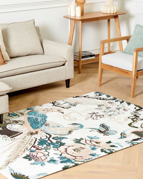 Teppich mit Vögeln und Blumenmotiv. Verleihen Sie Ihrem Wohnzimmer mit diesem schönen Teppich eine besondere Note. Mit Vögeln und Blumenmotiven ist der Teppich ein wirklich dekoratives Stück, das ein elegantes und rustikales Design vereint. Aus Baumwolle gefertigt, ist er sehr weich und dennoch strapazierfähig. Wenn Sie den Teppich in der Mitte Ihres Zimmers auslegen, wirkt Ihr Interieur noch eleganter und stilvoller. Details: Typ Kurzflor. Farbe: Bunt. Farbton: Türkis. Material: Stoff. Material: Baumwolle. Zusätzliches Material: Polyester. Rückseitenmaterial: Baumwolle. Zusammenstellung: 70% Baumwolle. Form: Rechteckig. Rutschfeste Unterseite: Nein. Stoffgewicht: 2200 g/m2. Muster: Blumenmuster. Herstellungsmethode: Jacquardgewebt. Abmessungen: Florhöhe: 1 cm. Breite: 140 cm. Länge: 200 cm. Gewicht: 6.5 kg. .Sie kaufen: 1 x Teppich. Produktvorteile: Wunderbar geeignet für Schlaf- und Wohnbereich, Dekorativ und zugleich funktional, Wunderschöne, leuchtende Farben, Nur für Innenräume geeignet, Pflegeleichtes und strapazierfähiges Material. Montage: Benötigt keine Montage. Zusatzinformationen: Der Artikel benötigt einige Zeit, bis er seinen ursprünglichen Zustand erreicht hat – daher sollte er so schnell wie möglich ausgerollt werden und innerhalb von 72 Stunden seine vollständige Größe wieder erreichen. Für einen optimalen Effekt sollte man die Teppichkanten mit schweren Gegenständen fixieren. Pflegeanleitung: 1.Staubsaugen einmal pro Woche ist ausreichend, um den Teppich sauber und gepflegt zu halten. Wir empfehlen dazu einen Staubsauger mit flacher, weicher Bürste und die Einstellung von mittlerer Saugleistung. Saugen Sie Ihren Teppich immer in Florrichtung ab. 2.Soweit das Format dies zulässt, drehen Sie den Teppich alle sechs Monate um 180 Grad. So erhalten sie eine gleichmäßige Abnutzung und vermeiden Sie Verbleichen der Farben durch Sonneneinstrahlung. 3.Entfernen Sie Flecken umgehend. Flüssigkeiten werden mit einem saugfähigen, nicht färbenden Baumwolltuch aufgenommen. Arbeiten Sie vom Rand nach innen und verreiben Sie den Fleck nicht. 4.Bei festem Schmutz können Sie die losen Schmutzteile vorsichtig abkratzen. Danach wird die Stelle mit klarem, lauwarmem Wasser abgetupft. Benutzen Sie dazu ein sauberes nicht färbendes Baumwolltuch sowie einen Fleckentferner speziell für Teppiche. Bitte befeuchten Sie den Teppich dabei nicht zu stark. Falls der Fleck hartnäckig sein sollte, wenden Sie sich bitte an ein Fachgeschäft für Teppichreinigungen. 5.Es wird empfohlen den ausgepackten Teppich mindestens ein paar Stunden (am besten ein oder zwei Tage) zu lüften. Dies ermöglicht den natürlichen Geruch des Materials, aus dem das Produkt gefertigt wurde, zu mildern.