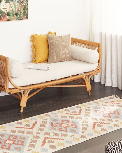 Handgewebter, rechteckiger Baumwollteppich mit geometrischem Muster und hellen Fransen. Setzen Sie auf diesen hochwertigen Kelim, der mit seinem farbenfrohen Muster jedem Ihrer Wohnbereiche mehr Wärme und einen charmanten Look verleihen wird. Traditionell in Handarbeit aus Baumwolle gewebt, bietet er hohe Qualität, die Sie jahrelang erfreuen wird. Dank dieser natürlichen Materialien und seiner angenehmen Oberfläche werden Ihre Füße bei jedem Schritt verwöhnt. So wird sich dieser Vorleger vor allem in stark frequentierten Wohnflächen, wie Flur, Schlaf- oder Wohnbereich beweisen. Die zusätzlichen Fransen an den Seiten des Flachgewebeteppichs verleihen ihm einen besonders anregenden Touch. Das prächtige Motiv befindet sich auf der Ober- und Unterseite des Läufers, so kann er beidseitig benutzt werden. Details: Typ Kelim. Farbe: Bunt. Material: Stoff. Material: Baumwolle. Rückseitenmaterial: Baumwolle. Zusammenstellung: 100% Baumwolle. Form: Rechteckig. Rutschfeste Unterseite: Nein. Stoffgewicht: 1000 g/m2. Muster: Geometrisches Muster. Herstellungsmethode: Handgewebt. Abmessungen: Florhöhe: 0.5 cm. Breite: 80 cm. Länge: 300 cm. Gewicht: 3 kg. .Sie kaufen: 1 x Teppich. Produktvorteile: Handgefertigt mit viel Liebe zum Detail, Wunderbar geeignet für Schlaf- und Wohnbereich, Dekorativ und zugleich funktional, Hohe Qualität, Pflegeleichtes und strapazierfähiges Material. Montage: Benötigt keine Montage. Zusatzinformationen: Da der Teppich handgewebt ist, können kleine Farb-, Muster-, bzw. Grössendifferenzen auftreten. Diese Unterschiede stellen jedoch keinen Produktfehler dar. Der Artikel benötigt einige Zeit, bis er seinen ursprünglichen Zustand erreicht hat – daher sollte er so schnell wie möglich ausgerollt werden und innerhalb von 72 Stunden seine vollständige Größe wieder erreichen. Für einen optimalen Effekt sollte man die Teppichkanten mit schweren Gegenständen fixieren. Pflegeanleitung: 1.Von Hand oder mit einem Feinwäsche-Programm bei max. 30°C waschen, wenn auf dem Etikett keine weiteren Hinweise des Herstellers gegeben sind. 2.Wenn auf dem Etikett nicht anders angegeben, bitte nicht im Trockner trocknen und auch nicht bügeln.