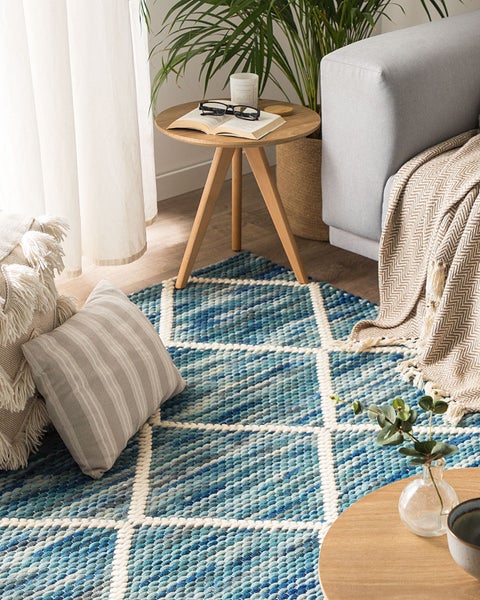 Rechteckiger Wollteppich mit Farbverlauf und weißem Karomuster. Der schöne Farbverlauf von unterschiedlichen Blautönen verleiht diesem Teppich eine sehr dekorative Note. Dank des weißen Karomusters harmoniert er zudem wunderbar mit modernen Möbeln und Accessoires im Marinestil. Die hochwertige Fertigung und weichen Materialien sorgen für ein angenehmes Gefühl unter den Füßen. Details: Typ Kurzflor. Stil: Modern. Farbe: Blau. Farbton: Hellblau. Material: Stoff. Material: Wolle. Zusätzliches Material: Polyester. Form: Rechteckig. Rutschfeste Unterseite: Nein. Stoffgewicht: 2200 g/m2. Muster: Geometrisches Muster. Geeignet für Fußbodenheizung: Nein. Herstellungsmethode: Handgewebt. Abmessungen: Florhöhe: 1.5 cm. Breite: 140 cm. Länge: 200 cm. Gewicht: 7 kg. .Sie kaufen: 1 x Teppich. Produktvorteile: Herrlich weich, Klassisches Design, Perfekte Ergänzung für Ihr Heim und für jeden Einrichtungsstil, Hochwertiges Material, Handgefertigte Präzision. Montage: Benötigt keine Montage. Zusatzinformationen: Der Artikel könnte Haare verlieren. Dies ist ein normaler Vorgang und stellt keinen Qualitätsmangel des Produkts dar. Da der Teppich handgewebt ist, können kleine Farb-, Muster-, bzw. Grössendifferenzen auftreten. Diese Unterschiede stellen jedoch keinen Produktfehler dar. Der Artikel benötigt einige Zeit, bis er seinen ursprünglichen Zustand erreicht hat – daher sollte er so schnell wie möglich ausgerollt werden und innerhalb von 72 Stunden seine vollständige Größe wieder erreichen. Für einen optimalen Effekt sollte man die Teppichkanten mit schweren Gegenständen fixieren. Pflegeanleitung: 1.Es wird empfohlen den ausgepackten Teppich mindestens ein paar Stunden (am besten ein oder zwei Tage) zu lüften. Dies ermöglicht den natürlichen Geruch des Materials, aus dem das Produkt gefertigt wurde, zu mildern, 2.Entfernen Sie Flecken umgehend. Flüssigkeiten werden mit einem saugfähigen, nicht färbenden Baumwolltuch aufgenommen. Arbeiten Sie vom Rand nach innen und verreiben Sie den Fleck nicht. 3.Soweit das Format dies zulässt, drehen Sie den Teppich alle sechs Monate um 180 Grad. So erhalten sie eine gleichmäßige Abnutzung und vermeiden Sie Verbleichen der Farben durch Sonneneinstrahlung. 4.Bei festem Schmutz können Sie die losen Schmutzteile vorsichtig abkratzen. Danach wird die Stelle mit klarem, lauwarmem Wasser abgetupft. Benutzen Sie dazu ein sauberes nicht färbendes Baumwolltuch sowie einen Fleckentferner speziell für Teppiche. Bitte befeuchten Sie den Teppich dabei nicht zu stark. Falls der Fleck hartnäckig sein sollte, wenden Sie sich bitte an ein Fachgeschäft für Teppichreinigungen. 5.Staubsaugen einmal pro Woche ist ausreichend, um den Teppich sauber und gepflegt zu halten. Wir empfehlen dazu einen Staubsauger mit flacher, weicher Bürste und die Einstellung von mittlerer Saugleistung. Saugen Sie Ihren Teppich immer in Florrichtung ab.