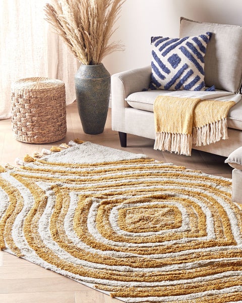 Teppich mit Quasten und modernem Muster in Beige und Senfgelb. Das abstrakte Muster und die dekorativen Quasten an den Seiten lassen diesen Teppich interessant und stilvoll wirken. Wenn Sie ein modernes Flair in Ihren Raum bringen möchten, ist dieser Teppich eine gute Wahl. Er ist zudem aus hochwertiger und angenehmer Baumwolle handgetuftet. Legen Sie ihn neben Ihr Sofa oder Bett, um einen echten Eyecatcher im Raum zu schaffen. Details: Typ Kurzflor. Stil: Boho. Farbe: Beige. Farbton: Hellbeige. Material: Stoff. Material: Baumwolle. Zusammenstellung: 100% Baumwolle. Form: Rechteckig. Rutschfeste Unterseite: Nein. Stoffgewicht: 1050 g/m2. Muster: Abstraktes Muster. Herstellungsmethode: Handgetuftet. Abmessungen: Florhöhe: 1.5 cm. Breite: 160 cm. Länge: 230 cm. Gewicht: 4.3 kg. .Sie kaufen: 1 x Teppich. Produktvorteile: Geeignet für Fussbodenheizung, Handgefertigt mit viel Liebe zum Detail, Wunderbar geeignet für Schlaf- und Wohnbereich, Modernes Design, Hohe Qualität, Pflegeleichtes und strapazierfähiges Material. Montage: Benötigt keine Montage. Zusatzinformationen: Da der Teppich handgewebt ist, können kleine Farb-, Muster-, bzw. Grössendifferenzen auftreten. Diese Unterschiede stellen jedoch keinen Produktfehler dar. Der Artikel könnte Haare verlieren. Dies ist ein normaler Vorgang und stellt keinen Qualitätsmangel des Produkts dar. Der Artikel benötigt einige Zeit, bis er seinen ursprünglichen Zustand erreicht hat – daher sollte er so schnell wie möglich ausgerollt werden und innerhalb von 72 Stunden seine vollständige Größe wieder erreichen. Für einen optimalen Effekt sollte man die Teppichkanten mit schweren Gegenständen fixieren. Herstellungstechnik: Beim Handtuftverfahren wird das Garn mit einer speziellen Nadel in das Trägermaterial des Teppichs eingestochen. Dabei wird das Garn nicht so fest in das Trägermaterial eingearbeitet wie bei anderen Methoden (z.B. Webteppiche). Daher können sich manchmal einzelne Fäden lösen. Pflegeanleitung: 1.Staubsaugen einmal pro Woche ist ausreichend, um den Teppich sauber und gepflegt zu halten. Wir empfehlen dazu einen Staubsauger mit flacher, weicher Bürste und die Einstellung von mittlerer Saugleistung. Saugen Sie Ihren Teppich immer in Florrichtung ab. 2.Soweit das Format dies zulässt, drehen Sie den Teppich alle sechs Monate um 180 Grad. So erhalten sie eine gleichmäßige Abnutzung und vermeiden Sie Verbleichen der Farben durch Sonneneinstrahlung. 3.Entfernen Sie Flecken umgehend. Flüssigkeiten werden mit einem saugfähigen, nicht färbenden Baumwolltuch aufgenommen. Arbeiten Sie vom Rand nach innen und verreiben Sie den Fleck nicht. 4.Bei festem Schmutz können Sie die losen Schmutzteile vorsichtig abkratzen. Danach wird die Stelle mit klarem, lauwarmem Wasser abgetupft. Benutzen Sie dazu ein sauberes nicht färbendes Baumwolltuch sowie einen Fleckentferner speziell für Teppiche. Bitte befeuchten Sie den Teppich dabei nicht zu stark. Falls der Fleck hartnäckig sein sollte, wenden Sie sich bitte an ein Fachgeschäft für Teppichreinigungen. 5.Es wird empfohlen den ausgepackten Teppich mindestens ein paar Stunden (am besten ein oder zwei Tage) zu lüften. Dies ermöglicht den natürlichen Geruch des Materials, aus dem das Produkt gefertigt wurde, zu mildern.