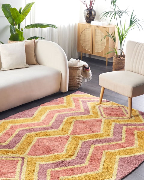 Handgetufteter Teppich mit auffälligem Muster in Rot, Lila und Senfgelb. Wenn Sie Ihr Zuhause etwas aufpeppen möchten, dann ist dieser Teppich die richtige Wahl. Die Kombination aus fröhlichen Farben und einem ausgefallenen Muster belebt jeden Raum. Außerdem ist der Teppich vollständig aus Baumwolle gefertigt, was ihn bequem und langlebig macht. Dank seines Designs macht er sowohl im Wohnzimmer als auch im Schlaf- oder Kinderzimmer eine gute Figur. Details: Typ Kurzflor. Stil: Retro. Farbe: Bunt. Farbton: Senfgelb. Material: Stoff. Material: Baumwolle. Zusammenstellung: 100% Baumwolle. Form: Rechteckig. Rutschfeste Unterseite: Nein. Stoffgewicht: 1500 g/m2. Muster: Geometrisches Muster. Geeignet für Fußbodenheizung: Ja. Herstellungsmethode: Handgetuftet. Abmessungen: Florhöhe: 1.5 cm. Breite: 160 cm. Länge: 230 cm. Gewicht: 5.5 kg. .Sie kaufen: 1 x Teppich. Produktvorteile: Geeignet für Fussbodenheizung, Handgefertigt mit viel Liebe zum Detail, Wunderschöne, leuchtende Farben, Wunderbar geeignet für Schlaf- und Wohnbereich, Hohe Qualität, Pflegeleichtes und strapazierfähiges Material. Montage: Benötigt keine Montage. Zusatzinformationen: Da der Teppich handgewebt ist, können kleine Farb-, Muster-, bzw. Grössendifferenzen auftreten. Diese Unterschiede stellen jedoch keinen Produktfehler dar. Der Artikel könnte Haare verlieren. Dies ist ein normaler Vorgang und stellt keinen Qualitätsmangel des Produkts dar. Der Artikel benötigt einige Zeit, bis er seinen ursprünglichen Zustand erreicht hat – daher sollte er so schnell wie möglich ausgerollt werden und innerhalb von 72 Stunden seine vollständige Größe wieder erreichen. Für einen optimalen Effekt sollte man die Teppichkanten mit schweren Gegenständen fixieren. Herstellungstechnik: Beim Handtuftverfahren wird das Garn mit einer speziellen Nadel in das Trägermaterial des Teppichs eingestochen. Dabei wird das Garn nicht so fest in das Trägermaterial eingearbeitet wie bei anderen Methoden (z.B. Webteppiche). Daher können sich manchmal einzelne Fäden lösen. Pflegeanleitung: Baumwolle: 1.Es wird empfohlen den ausgepackten Teppich mindestens ein paar Stunden (am besten ein oder zwei Tage) zu lüften. Dies ermöglicht den natürlichen Geruch des Materials, aus dem das Produkt gefertigt wurde, zu mildern, 2.Entfernen Sie Flecken umgehend. Flüssigkeiten werden mit einem saugfähigen, nicht färbenden Baumwolltuch aufgenommen. Arbeiten Sie vom Rand nach innen und verreiben Sie den Fleck nicht. 3.Soweit das Format dies zulässt, drehen Sie den Teppich alle sechs Monate um 180 Grad. So erhalten sie eine gleichmäßige Abnutzung und vermeiden Sie Verbleichen der Farben durch Sonneneinstrahlung. 4.Bei festem Schmutz können Sie die losen Schmutzteile vorsichtig abkratzen. Danach wird die Stelle mit klarem, lauwarmem Wasser abgetupft. Benutzen Sie dazu ein sauberes nicht färbendes Baumwolltuch sowie einen Fleckentferner speziell für Teppiche. Bitte befeuchten Sie den Teppich dabei nicht zu stark. Falls der Fleck hartnäckig sein sollte, wenden Sie sich bitte an ein Fachgeschäft für Teppichreinigungen. 5.Staubsaugen einmal pro Woche ist ausreichend, um den Teppich sauber und gepflegt zu halten. Wir empfehlen dazu einen Staubsauger mit flacher, weicher Bürste und die Einstellung von mittlerer Saugleistung. Saugen Sie Ihren Teppich immer in Florrichtung ab.