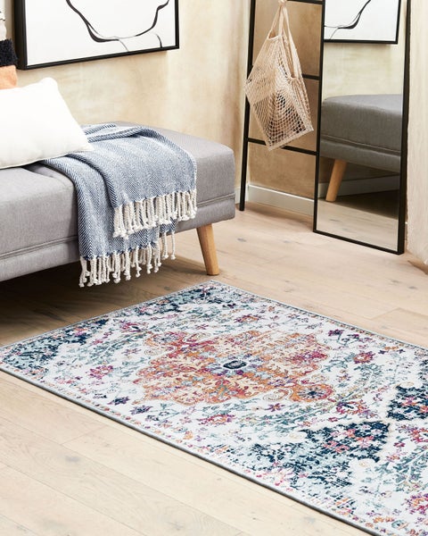 Moderner Teppich im Vintage-Stil. Mit diesem orientalisch inspirierten Teppich verleihen Sie einem ausgewählten Raum in Ihrem Zuhause einen Touch von Vintage-Charakter. Das mehrfarbige Blumenmuster auf beigefarbenem Hintergrund in Kombination mit dem Vintage-Effekt sorgt für eine ungewöhnliche Dekoration, die sich perfekt in Innenräume verschiedener, auch moderner Stile einfügt. Ausserdem ist das Stück mit einer rutschfesten Unterseite ausgestattet, so dass es auch in stark frequentierten Bereichen eine gute Wahl ist. Details: Typ Läufer. Stil: Retro. Farbe: Bunt. Material: Stoff. Material: Polyester. Rückseitenmaterial: Polyester. Zusammenstellung: 100% Polyester. Form: Rechteckig. Rutschfeste Unterseite: Ja. Stoffgewicht: 180 g/m2. Muster: Orientalisches Muster. Geeignet für Fußbodenheizung: Ja. Herstellungsmethode: Maschinengewebt. Abmessungen: Florhöhe: 1 cm. Breite: 80 cm. Länge: 200 cm. Gewicht: 1.6 kg. .Sie kaufen: 1 x Teppich. Produktvorteile: Geeignet für Fussbodenheizung, Besonders sicher dank rutschfester Unterseite, Herrlich weich, Zeitloses Design, Hohe Qualität, Pflegeleichtes und strapazierfähiges Material. Montage: Benötigt keine Montage. Zusatzinformationen: Der Artikel benötigt einige Zeit, bis er seinen ursprünglichen Zustand erreicht hat – daher sollte er so schnell wie möglich ausgerollt werden und innerhalb von 72 Stunden seine vollständige Größe wieder erreichen. Für einen optimalen Effekt sollte man die Teppichkanten mit schweren Gegenständen fixieren. Pflegeanleitung: Polyester: 1.Es wird empfohlen den ausgepackten Teppich mindestens ein paar Stunden (am besten ein oder zwei Tage) zu lüften. Dies ermöglicht den natürlichen Geruch des Materials, aus dem das Produkt gefertigt wurde, zu mildern, 2.Entfernen Sie Flecken umgehend. Flüssigkeiten werden mit einem saugfähigen, nicht färbenden Baumwolltuch aufgenommen. Arbeiten Sie vom Rand nach innen und verreiben Sie den Fleck nicht. 3.Soweit das Format dies zulässt, drehen Sie den Teppich alle sechs Monate um 180 Grad. So erhalten sie eine gleichmäßige Abnutzung und vermeiden Sie Verbleichen der Farben durch Sonneneinstrahlung. 4.Bei festem Schmutz können Sie die losen Schmutzteile vorsichtig abkratzen. Danach wird die Stelle mit klarem, lauwarmem Wasser abgetupft. Benutzen Sie dazu ein sauberes nicht färbendes Baumwolltuch sowie einen Fleckentferner speziell für Teppiche. Bitte befeuchten Sie den Teppich dabei nicht zu stark. Falls der Fleck hartnäckig sein sollte, wenden Sie sich bitte an ein Fachgeschäft für Teppichreinigungen. 5.Staubsaugen einmal pro Woche ist ausreichend, um den Teppich sauber und gepflegt zu halten. Wir empfehlen dazu einen Staubsauger mit flacher, weicher Bürste und die Einstellung von mittlerer Saugleistung. Saugen Sie Ihren Teppich immer in Florrichtung ab.