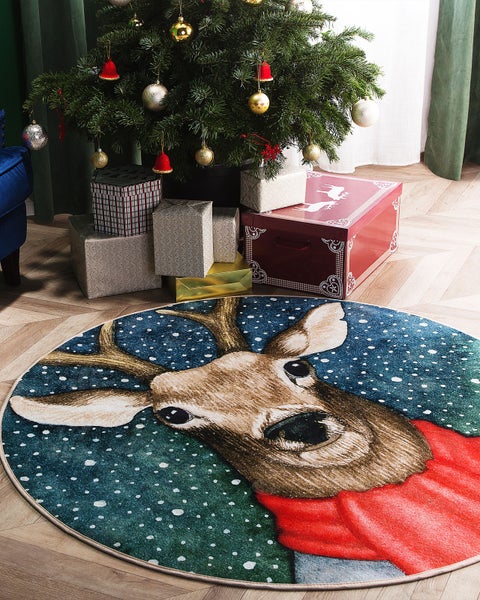 Origineller runder Teppich in winterlichem Muster mit Rentier. Das dekorative, gedruckte Winter-Muster mit Schneeflocken und einem Rentier in der Mitte lässt sofort vorweihnachtliche Stimmung aufkommen. Der maschinengewebte, runde Teppich aus pflegeleichtem, hochwertigem Polyester-Filz ist die perfekte Ergänzung für den Sitzbereich vor dem Kamin und lässt jeden Raum sehr angenehm, komfortabel und schön erscheinen. Dank der rutschfesten Unterseite schont der Teppich den Fußboden. Details: Typ Kurzflor. Farbe: Bunt. Farbton: Dunkelblau. Material: Stoff. Material: Polyester. Rückseitenmaterial: Polyester. Zusammenstellung: 100% Polyester. Form: Rund. Rutschfeste Unterseite: Ja. Stoffgewicht: 200 g/m2. Muster: Tiermuster. Herstellungsmethode: Maschinengewebt. Abmessungen: Florhöhe: 0.5 cm. Breite: 120 cm. Länge: 120 cm. Gewicht: 1 kg. .Sie kaufen: 1 x Teppich. Produktvorteile: Der Filzrücken sorgt für optimalen Komfort und Haltbarkeit, Besonders sicher dank rutschfester Unterseite, Gemütliche Ausstrahlung, Ein einzigartiger Hingucker, Hohe Qualität, Besonders pflegeleicht. Montage: Benötigt keine Montage. Zusatzinformationen: Der Artikel könnte Haare verlieren. Dies ist ein normaler Vorgang und stellt keinen Qualitätsmangel des Produkts dar. Pflegeanleitung: 1.Staubsaugen einmal pro Woche ist ausreichend, um den Teppich sauber und gepflegt zu halten. Wir empfehlen dazu einen Staubsauger mit flacher, weicher Bürste und die Einstellung von mittlerer Saugleistung. Saugen Sie Ihren Teppich immer in Florrichtung ab. 2.Soweit das Format dies zulässt, drehen Sie den Teppich alle sechs Monate um 180 Grad. So erhalten sie eine gleichmäßige Abnutzung und vermeiden Sie Verbleichen der Farben durch Sonneneinstrahlung. 3.Entfernen Sie Flecken umgehend. Flüssigkeiten werden mit einem saugfähigen, nicht färbenden Baumwolltuch aufgenommen. Arbeiten Sie vom Rand nach innen und verreiben Sie den Fleck nicht. 4.Bei festem Schmutz können Sie die losen Schmutzteile vorsichtig abkratzen. Danach wird die Stelle mit klarem, lauwarmem Wasser abgetupft. Benutzen Sie dazu ein sauberes nicht färbendes Baumwolltuch sowie einen Fleckentferner speziell für Teppiche. Bitte befeuchten Sie den Teppich dabei nicht zu stark. Falls der Fleck hartnäckig sein sollte, wenden Sie sich bitte an ein Fachgeschäft für Teppichreinigungen. 5.Es wird empfohlen den ausgepackten Teppich mindestens ein paar Stunden (am besten ein oder zwei Tage) zu lüften. Dies ermöglicht den natürlichen Geruch des Materials, aus dem das Produkt gefertigt wurde, zu mildern.
