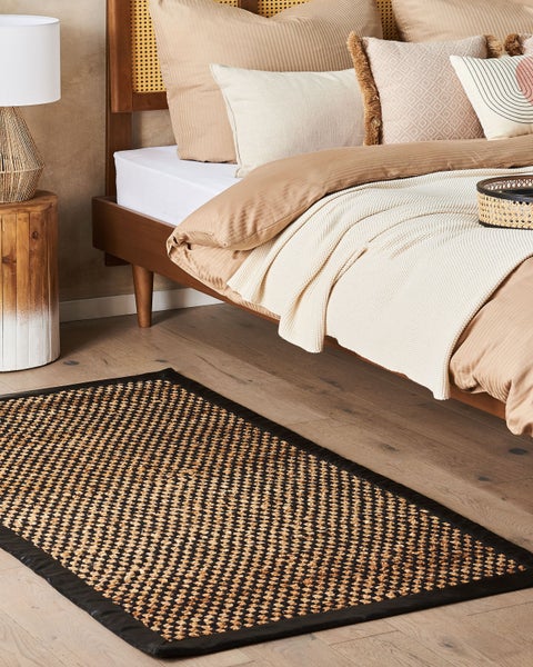 Moderner, rechteckiger Kurzflor Teppich aus Jute, Baumwolle und Leder. Eine Farbkombination, die jedem Innenraum eine rustikale Optik verleiht. Die Mischung aus strapazierfähigen, natürlichen Jute- und Baumwollfasern sowie dem schwarz gefärbten Echtleder kreiert ein besonderes Muster und eine Oberfläche, die sehr angenehm unter den Füßen ist. Kombinieren Sie ihn mit einer Couch oder mehreren Sesseln, um Ihren edlen Laminat- oder Parkettboden zu betonen. Details: Typ Kurzflor. Farbe: Schwarz. Material: Stoff. Material: Jute. Zusätzliches Material: Baumwolle. Zusammenstellung: 60% Jute. Form: Rechteckig. Rutschfeste Unterseite: Nein. Muster: Kariertes Muster. Herstellungsmethode: Handgewebt. Abmessungen: Florhöhe: 0.5 cm. Breite: 80 cm. Länge: 150 cm. Gewicht: 2.9 kg. .Sie kaufen: 1 x Teppich. Produktvorteile: Geeignet für Fussbodenheizung, Trendy Farben und Design, Wunderbar geeignet für Schlaf- und Wohnbereich, Handgefertigte Präzision, Qualitativ hochwertiges Material, Besonders pflegeleicht. Montage: Benötigt keine Montage. Zusatzinformationen: Der Artikel könnte Haare verlieren. Dies ist ein normaler Vorgang und stellt keinen Qualitätsmangel des Produkts dar. Da der Teppich handgewebt ist, können kleine Farb-, Muster-, bzw. Grössendifferenzen auftreten. Diese Unterschiede stellen jedoch keinen Produktfehler dar. Der Artikel benötigt einige Zeit, bis er seinen ursprünglichen Zustand erreicht hat – daher sollte er so schnell wie möglich ausgerollt werden und innerhalb von 72 Stunden seine vollständige Größe wieder erreichen. Für einen optimalen Effekt sollte man die Teppichkanten mit schweren Gegenständen fixieren. Um die Qualität und Langlebigkeit des Materials zu erhalten, sollten Sie den Teppich nicht in stark beanspruchten Bereichen platzieren. Pflegeanleitung: 1.Staubsaugen einmal pro Woche ist ausreichend, um den Teppich sauber und gepflegt zu halten. Wir empfehlen dazu einen Staubsauger mit flacher, weicher Bürste und die Einstellung von mittlerer Saugleistung. Saugen Sie Ihren Teppich immer in Florrichtung ab. 2.Soweit das Format dies zulässt, drehen Sie den Teppich alle sechs Monate um 180 Grad. So erhalten sie eine gleichmäßige Abnutzung und vermeiden Sie Verbleichen der Farben durch Sonneneinstrahlung. 3.Entfernen Sie Flecken umgehend. Flüssigkeiten werden mit einem saugfähigen, nicht färbenden Baumwolltuch aufgenommen. Arbeiten Sie vom Rand nach innen und verreiben Sie den Fleck nicht. 4.Bei festem Schmutz können Sie die losen Schmutzteile vorsichtig abkratzen. Danach wird die Stelle mit klarem, lauwarmem Wasser abgetupft. Benutzen Sie dazu ein sauberes nicht färbendes Baumwolltuch sowie einen Fleckentferner speziell für Teppiche. Bitte befeuchten Sie den Teppich dabei nicht zu stark. Falls der Fleck hartnäckig sein sollte, wenden Sie sich bitte an ein Fachgeschäft für Teppichreinigungen. 5.Es wird empfohlen den ausgepackten Teppich mindestens ein paar Stunden (am besten ein oder zwei Tage) zu lüften. Dies ermöglicht den natürlichen Geruch des Materials, aus dem das Produkt gefertigt wurde, zu mildern.