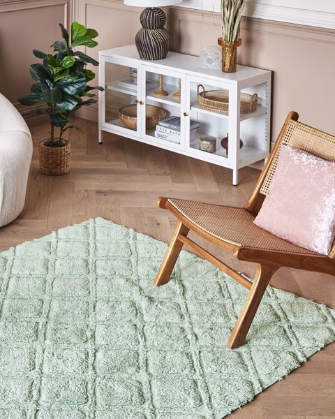 Rechteckiger, handgetufteter Baumwollteppich mit geometischem Muster. Vervollständigen Sie den Look Ihres Wohn- oder Schlafzimmers mit einem Vorleger, der mit seinem Design die gesamte Einrichtung verschönert. Dieser Kuschelteppich besteht aus natürlichen Baumwollfasern, die ihm eine vortreffliche Weihcheit und eine unbezwungene Schönheit versprechen. Dabei besticht das Modell auch mit seiner angenehmen Farbwahl, die sich in allen eklektischen Räumen beweisen wird sowie seiner handgetufteten Herstellung, die ihm seine Einzigartigkeit garantiert. Kombinieren Sie ihn mit anderen gedeckten Farbtönen, um einen besonders gemütlichen Look zu kreieren. Details: Typ Kurzflor. Stil: Boho. Farbe: Grün. Farbton: Hellgrün. Material: Stoff. Material: Baumwolle. Zusammenstellung: 100% Baumwolle. Form: Rechteckig. Rutschfeste Unterseite: Nein. Stoffgewicht: 1075 g/m2. Muster: Geometrisches Muster. Geeignet für Fußbodenheizung: Nein. Herstellungsmethode: Handgetuftet. Abmessungen: Florhöhe: 1.4 cm. Breite: 160 cm. Länge: 230 cm. Gewicht: 3.8 kg. .Sie kaufen: 1 x Teppich. Produktvorteile: Geeignet für Fussbodenheizung, Herrlich weich, Wunderbar geeignet für Schlaf- und Wohnbereich, Erzeugt Wohlfühlcharakter in jedem Raum, Passt ausgezeichnet zu vielen Einrichtungsstilen, Handgefertigte Präzision. Montage: Benötigt keine Montage. Zusatzinformationen: Der Artikel könnte Haare verlieren. Dies ist ein normaler Vorgang und stellt keinen Qualitätsmangel des Produkts dar. Der Artikel benötigt einige Zeit, bis er seinen ursprünglichen Zustand erreicht hat – daher sollte er so schnell wie möglich ausgerollt werden und innerhalb von 72 Stunden seine vollständige Größe wieder erreichen. Für einen optimalen Effekt sollte man die Teppichkanten mit schweren Gegenständen fixieren. Herstellungstechnik: Beim Handtuftverfahren wird das Garn mit einer speziellen Nadel in das Trägermaterial des Teppichs eingestochen. Dabei wird das Garn nicht so fest in das Trägermaterial eingearbeitet wie bei anderen Methoden (z.B. Webteppiche). Daher können sich manchmal einzelne Fäden lösen. Pflegeanleitung: 1.Soweit das Format dies zulässt, drehen Sie den Teppich alle sechs Monate um 180 Grad. So erhalten sie eine gleichmäßige Abnutzung und vermeiden Sie Verbleichen der Farben durch Sonneneinstrahlung. 2.Bei festem Schmutz können Sie die losen Schmutzteile vorsichtig abkratzen. Danach wird die Stelle mit klarem, lauwarmem Wasser abgetupft. Benutzen Sie dazu ein sauberes nicht färbendes Baumwolltuch sowie einen Fleckentferner speziell für Teppiche. Bitte befeuchten Sie den Teppich dabei nicht zu stark. Falls der Fleck hartnäckig sein sollte, wenden Sie sich bitte an ein Fachgeschäft für Teppichreinigungen. 3.Staubsaugen einmal pro Woche ist ausreichend, um den Teppich sauber und gepflegt zu halten. Wir empfehlen dazu einen Staubsauger mit flacher, weicher Bürste und die Einstellung von mittlerer Saugleistung. Saugen Sie Ihren Teppich immer in Florrichtung ab. 4.Es wird empfohlen den ausgepackten Teppich mindestens ein paar Stunden (am besten ein oder zwei Tage) zu lüften. Dies ermöglicht den natürlichen Geruch des Materials, aus dem das Produkt gefertigt wurde, zu mildern, 5.Entfernen Sie Flecken umgehend. Flüssigkeiten werden mit einem saugfähigen, nicht färbenden Baumwolltuch aufgenommen. Arbeiten Sie vom Rand nach innen und verreiben Sie den Fleck nicht.
