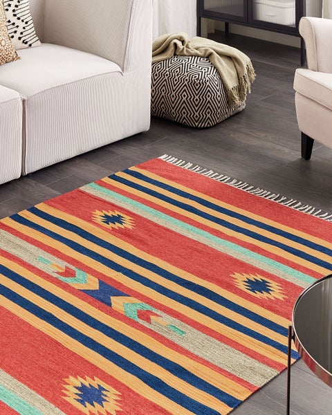 Handgewebter, rechteckiger Baumwollteppich mit mehrfarbigem Muster und hellen Fransen. Lassen Sie sich von dem einzigartigen Look dieses Kelims bezaubern und peppen Sie Ihre Wohnbereiche gekonnt auf. Der Vorleger besteht aus langlebiger, weicher Baumwolle und ist mit einem farbenprächtigen Motiv versehen. Seine leuchtenden Farben beleben Ihre Einrichtung und die hellen Fransen sorgen für einen gemütlichen Boho-Touch. Seine natürlichen, strapazierfähigen Fasern erlauben es Ihnen den Kurzfaserteppich in jedem Eingangsbereich oder Wohn-, Ess- oder Schlafzimmer zu platzieren. Zudem kann man das Modell auf beiden Seiten nutzen und sein farbechtes Design genießen. Für die Pflegeleichtigkeit ist auch gesorgt, da man den Wohnzimmerteppich bei Bedarf entweder mit dem Staubsauger reinigen oder in der Waschmaschine waschen kann. Details: Typ Kelim. Farbe: Bunt. Material: Stoff. Material: Baumwolle. Zusammenstellung: 100% Baumwolle. Form: Rechteckig. Rutschfeste Unterseite: Nein. Stoffgewicht: 900 g/m2. Muster: Geometrisches Muster. Geeignet für Fußbodenheizung: Nein. Herstellungsmethode: Handgewebt. Abmessungen: Florhöhe: 0.5 cm. Breite: 140 cm. Länge: 200 cm. Gewicht: 3 kg. .Sie kaufen: 1 x Teppich. Produktvorteile: Handgefertigt mit viel Liebe zum Detail, Beidseitiges Muster, Wunderbar geeignet für Schlaf- und Wohnbereich, Erzeugt Wohlfühlcharakter in jedem Raum, Hohe Qualität, In der Waschmaschine als Ganzes waschbar. Montage: Benötigt keine Montage. Zusatzinformationen: Der Artikel könnte Haare verlieren. Dies ist ein normaler Vorgang und stellt keinen Qualitätsmangel des Produkts dar. Da der Teppich handgewebt ist, können kleine Farb-, Muster-, bzw. Grössendifferenzen auftreten. Diese Unterschiede stellen jedoch keinen Produktfehler dar. Der Artikel benötigt einige Zeit, bis er seinen ursprünglichen Zustand erreicht hat – daher sollte er so schnell wie möglich ausgerollt werden und innerhalb von 72 Stunden seine vollständige Größe wieder erreichen. Für einen optimalen Effekt sollte man die Teppichkanten mit schweren Gegenständen fixieren. Pflegeanleitung: 1.Wenn auf dem Etikett nicht anders angegeben, bitte nicht im Trockner trocknen und auch nicht bügeln. 2.Von Hand oder mit einem Feinwäsche-Programm bei max. 30°C waschen, wenn auf dem Etikett keine weiteren Hinweise des Herstellers gegeben sind.