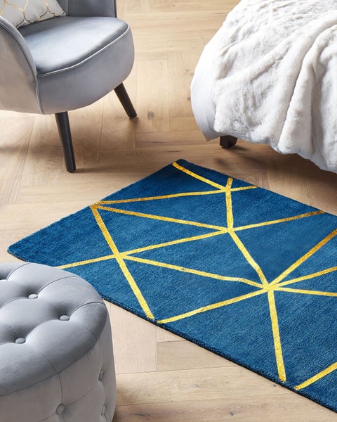 Moderner, rechteckiger Teppich in Marineblau und Gold. Der Teppich wurde aus Viskose gefertigt, die mit ihrem samtigen Glanz und den zusätzlichen goldenen Verzierungen einen Hauch an Luxus und Gemütlichkeit in jeden Raum bringt. Dieses Modell besticht durch seine besondere Qualität und weiche Oberfläche über die Sie mit Freude auch Barfuß gehen werden. Der Viskose-Teppich speichert sehr gut Wärme, sammelt keine statische Elektrizität an und wirkt dank seiner sauber verarbeiteten Baumwoll-Unterseite schonend auf den Fußboden. Details: Typ Kurzflor. Farbe: Blau. Farbton: Dunkelblau. Material: Stoff. Material: Viskose. Rückseitenmaterial: Baumwolle. Zusammenstellung: 100% Viskose. Form: Rechteckig. Rutschfeste Unterseite: Nein. Stoffgewicht: 2100 g/m2. Muster: Geometrisches Muster. Herstellungsmethode: Gewebt am Handwebstuhl. Abmessungen: Florhöhe: 0.5 cm. Breite: 80 cm. Länge: 150 cm. Gewicht: 4.2 kg. .Sie kaufen: 1 x Teppich. Produktvorteile: Handgefertigt mit viel Liebe zum Detail, Erzeugt Wohlfühlcharakter in jedem Raum, Elegante Optik, Auffälliges, dekoratives Muster, Weiches Gewebe mit angenehmer Haptik. Montage: Benötigt keine Montage. Zusatzinformationen: Der Artikel könnte Haare verlieren. Dies ist ein normaler Vorgang und stellt keinen Qualitätsmangel des Produkts dar. Da der Teppich handgewebt ist, können kleine Farb-, Muster-, bzw. Grössendifferenzen auftreten. Diese Unterschiede stellen jedoch keinen Produktfehler dar. Bitte beachten Sie, dass das Muster unter Verwendung eines Druckverfahrens erstellt wurde und daher nicht handgefertigt ist. Die sichtbaren Risse und Brüche im Muster gehen aus der Materialstruktur hervor und können in unterschiedlicher Intensität auftreten. Sie haben einen beabsichtigten, rein dekorativen Charakter und stellen keinen Qualitätsmangel des Produkts dar. Der Artikel benötigt einige Zeit, bis er seinen ursprünglichen Zustand erreicht hat – daher sollte er so schnell wie möglich ausgerollt werden und innerhalb von 72 Stunden seine vollständige Größe wieder erreichen. Für einen optimalen Effekt sollte man die Teppichkanten mit schweren Gegenständen fixieren. Bitte beachten Sie, dass Viskosefasern eine seidig glänzende Oberfläche haben, die je nach Faserrichtung und Lichtverhältnissen einen andere Farbschattierung annehmen kann. Pflegeanleitung: 1.Staubsaugen einmal pro Woche ist ausreichend, um den Teppich sauber und gepflegt zu halten. Wir empfehlen dazu einen Staubsauger mit flacher, weicher Bürste und die Einstellung von mittlerer Saugleistung. Saugen Sie Ihren Teppich immer in Florrichtung ab. 2.Soweit das Format dies zulässt, drehen Sie den Teppich alle sechs Monate um 180 Grad. So erhalten sie eine gleichmäßige Abnutzung und vermeiden Sie Verbleichen der Farben durch Sonneneinstrahlung. 3.Entfernen Sie Flecken umgehend. Flüssigkeiten werden mit einem saugfähigen, nicht färbenden Baumwolltuch aufgenommen. Arbeiten Sie vom Rand nach innen und verreiben Sie den Fleck nicht. 4.Bei festem Schmutz können Sie die losen Schmutzteile vorsichtig abkratzen. Danach wird die Stelle mit klarem, lauwarmem Wasser abgetupft. Benutzen Sie dazu ein sauberes nicht färbendes Baumwolltuch sowie einen Fleckentferner speziell für Teppiche. Bitte befeuchten Sie den Teppich dabei nicht zu stark. Falls der Fleck hartnäckig sein sollte, wenden Sie sich bitte an ein Fachgeschäft für Teppichreinigungen. 5.Es wird empfohlen den ausgepackten Teppich mindestens ein paar Stunden (am besten ein oder zwei Tage) zu lüften. Dies ermöglicht den natürlichen Geruch des Materials, aus dem das Produkt gefertigt wurde, zu mildern.