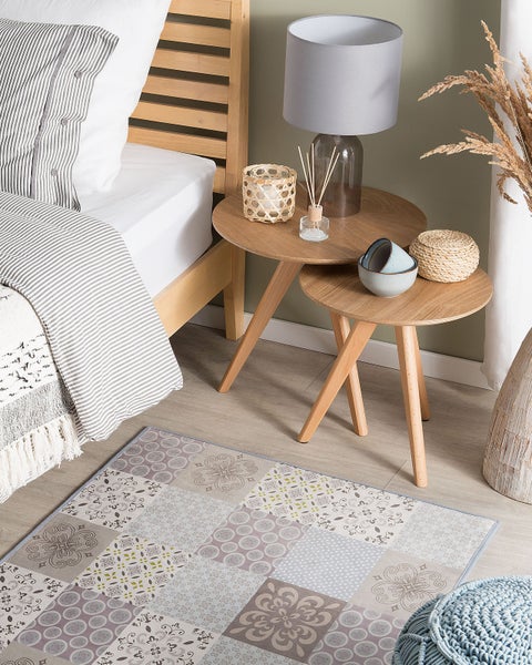 Teppich mit dekorativem Mosaik. Ein Hauch von mediterranem Flair in Ihrem Wohnbereich. Mit diesem sehr dekorativen Teppich zaubern Sie eine unwiderstehlich stilvolle Atmosphäre. Das Muster erinnert an portugiesische Fliesen, die hübsch aneinandergereiht sind. Zudem wurden dezente und dennoch sehr edle Farben gewählt, die sich perfekt mit anderen Accessoires und hellen Möbeln kombinieren lassen. Details: Typ Kurzflor. Farbe: Grau. Farbton: Hellgrau. Material: Stoff. Material: Polyester. Rückseitenmaterial: Polyester. Zusammenstellung: 100% Polyester. Form: Rechteckig. Rutschfeste Unterseite: Ja. Stoffgewicht: 200 g/m2. Muster: Patchwork. Herstellungsmethode: Maschinengewebt. Abmessungen: Florhöhe: 1 cm. Breite: 80 cm. Länge: 150 cm. Gewicht: 1 kg. .Sie kaufen: 1 x Teppich. Produktvorteile: Geeignet für Fussbodenheizung, Besonders sicher dank rutschfester Unterseite, Traditionelles Design mit moderner Note, Ansprechende Farbkombination, Pflegeleichtes und strapazierfähiges Material. Montage: Benötigt keine Montage. Zusatzinformationen: Der Artikel benötigt einige Zeit, bis er seinen ursprünglichen Zustand erreicht hat – daher sollte er so schnell wie möglich ausgerollt werden und innerhalb von 72 Stunden seine vollständige Größe wieder erreichen. Für einen optimalen Effekt sollte man die Teppichkanten mit schweren Gegenständen fixieren. Pflegeanleitung: 1.Staubsaugen einmal pro Woche ist ausreichend, um den Teppich sauber und gepflegt zu halten. Wir empfehlen dazu einen Staubsauger mit flacher, weicher Bürste und die Einstellung von mittlerer Saugleistung. Saugen Sie Ihren Teppich immer in Florrichtung ab. 2.Soweit das Format dies zulässt, drehen Sie den Teppich alle sechs Monate um 180 Grad. So erhalten sie eine gleichmäßige Abnutzung und vermeiden Sie Verbleichen der Farben durch Sonneneinstrahlung. 3.Entfernen Sie Flecken umgehend. Flüssigkeiten werden mit einem saugfähigen, nicht färbenden Baumwolltuch aufgenommen. Arbeiten Sie vom Rand nach innen und verreiben Sie den Fleck nicht. 4.Bei festem Schmutz können Sie die losen Schmutzteile vorsichtig abkratzen. Danach wird die Stelle mit klarem, lauwarmem Wasser abgetupft. Benutzen Sie dazu ein sauberes nicht färbendes Baumwolltuch sowie einen Fleckentferner speziell für Teppiche. Bitte befeuchten Sie den Teppich dabei nicht zu stark. Falls der Fleck hartnäckig sein sollte, wenden Sie sich bitte an ein Fachgeschäft für Teppichreinigungen. 5.Es wird empfohlen den ausgepackten Teppich mindestens ein paar Stunden (am besten ein oder zwei Tage) zu lüften. Dies ermöglicht den natürlichen Geruch des Materials, aus dem das Produkt gefertigt wurde, zu mildern.