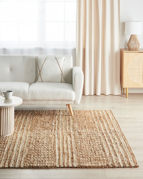 Rechteckiger, breiter Juteteppich mit verschiedenen Streifen. Legen Sie diesen Läufer in Ihren Flur, Ihr Schlafzimmer oder einen anderen Wohnbereich, um den Raum sofort mit seiner natürlichen Schönheit aufzuwerten. Dank der hochwertigen Jutefasern ist er sowohl langlebig als auch pflegeleicht. Dabei fühlt er sich angenehm unter den Füßen an und kann wegen seiner Strapazierfähigkeit besonders in stark frequentierten Bereichen eingesetzt werden. Der gesamte Teppich zeichnet sich durch seine wunderschöne, handgefertigte Verarbeitung aus. Seine dezente Farbwahl und das helle Streifenmuster zaubern Gemütlichkeit in alle Wohnräume und erlauben es Ihnen, den Teppich vor allem mit rustikalen Wohnstilen zu kombinieren. Zudem ist er für Fußbodenheizungen geeignet. Details: Typ Kurzflor. Farbe: Beige. Farbton: Hellbeige. Material: Stoff. Material: Jute. Zusammenstellung: 100% Jute. Form: Rechteckig. Rutschfeste Unterseite: Nein. Stoffgewicht: 3500-3600 g/m2. Muster: Streifenmuster. Herstellungsmethode: Handgewebt. Abmessungen: Florhöhe: 1 cm. Breite: 200 cm. Länge: 300 cm. Gewicht: 11 kg. .Sie kaufen: 1 x Teppich. Produktvorteile: Geeignet für Fussbodenheizung, Herrlich weich, Besonders pflegeleicht und langlebig, Handgefertigte Präzision, Natürliche Materialien. Montage: Benötigt keine Montage. Zusatzinformationen: Da der Teppich handgewebt ist, können kleine Farb-, Muster-, bzw. Grössendifferenzen auftreten. Diese Unterschiede stellen jedoch keinen Produktfehler dar. Der Artikel benötigt einige Zeit, bis er seinen ursprünglichen Zustand erreicht hat – daher sollte er so schnell wie möglich ausgerollt werden und innerhalb von 72 Stunden seine vollständige Größe wieder erreichen. Für einen optimalen Effekt sollte man die Teppichkanten mit schweren Gegenständen fixieren. Pflegeanleitung: 1.Staubsaugen einmal pro Woche ist ausreichend, um den Teppich sauber und gepflegt zu halten. Wir empfehlen dazu einen Staubsauger mit flacher, weicher Bürste und die Einstellung von mittlerer Saugleistung. Saugen Sie Ihren Teppich immer in Florrichtung ab. 2.Soweit das Format dies zulässt, drehen Sie den Teppich alle sechs Monate um 180 Grad. So erhalten sie eine gleichmäßige Abnutzung und vermeiden Sie Verbleichen der Farben durch Sonneneinstrahlung. 3.Entfernen Sie Flecken umgehend. Flüssigkeiten werden mit einem saugfähigen, nicht färbenden Baumwolltuch aufgenommen. Arbeiten Sie vom Rand nach innen und verreiben Sie den Fleck nicht. 4.Bei festem Schmutz können Sie die losen Schmutzteile vorsichtig abkratzen. Danach wird die Stelle mit klarem, lauwarmem Wasser abgetupft. Benutzen Sie dazu ein sauberes nicht färbendes Baumwolltuch sowie einen Fleckentferner speziell für Teppiche. Bitte befeuchten Sie den Teppich dabei nicht zu stark. Falls der Fleck hartnäckig sein sollte, wenden Sie sich bitte an ein Fachgeschäft für Teppichreinigungen. 5.Es wird empfohlen den ausgepackten Teppich mindestens ein paar Stunden (am besten ein oder zwei Tage) zu lüften. Dies ermöglicht den natürlichen Geruch des Materials, aus dem das Produkt gefertigt wurde, zu mildern.