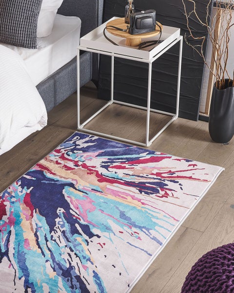 Rechteckiger, bunter Teppich mit einem Hauch an Extravaganz. Der weiße Untergrund aus Polyester-Filz ist kunstvoll mit einem abstrakten, farbenprächtigen Muster gestaltet. Die hochwertige Verarbeitung macht diesen Designer Teppich äußerst strapazierfähig und leicht zu reinigen. Dank seiner verspielten Ausstrahlung bildet er die perfekte Ergänzung für Ihren Innenbereich. Details: Typ Kurzflor. Farbe: Bunt. Material: Stoff. Material: Polyester. Rückseitenmaterial: Polyester. Zusammenstellung: 100% Polyester. Form: Rechteckig. Rutschfeste Unterseite: Ja. Stoffgewicht: 500 g/m2. Muster: Abstraktes Muster. Herstellungsmethode: Maschinengewebt. Abmessungen: Florhöhe: 0.5 cm. Breite: 80 cm. Länge: 150 cm. Gewicht: 1 kg. .Sie kaufen: 1 x Teppich. Produktvorteile: Besonders sicher dank rutschfester Unterseite, Herrlich weich, Ein einzigartiger Hingucker, Wunderschöne, leuchtende Farben, Verleiht jedem Raum eine einzigartige Note, Hohe Qualität. Montage: Benötigt keine Montage. Zusatzinformationen: Der Artikel könnte Haare verlieren. Dies ist ein normaler Vorgang und stellt keinen Qualitätsmangel des Produkts dar. Pflegeanleitung: 1.Staubsaugen einmal pro Woche ist ausreichend, um den Teppich sauber und gepflegt zu halten. Wir empfehlen dazu einen Staubsauger mit flacher, weicher Bürste und die Einstellung von mittlerer Saugleistung. Saugen Sie Ihren Teppich immer in Florrichtung ab. 2.Soweit das Format dies zulässt, drehen Sie den Teppich alle sechs Monate um 180 Grad. So erhalten sie eine gleichmäßige Abnutzung und vermeiden Sie Verbleichen der Farben durch Sonneneinstrahlung. 3.Entfernen Sie Flecken umgehend. Flüssigkeiten werden mit einem saugfähigen, nicht färbenden Baumwolltuch aufgenommen. Arbeiten Sie vom Rand nach innen und verreiben Sie den Fleck nicht. 4.Bei festem Schmutz können Sie die losen Schmutzteile vorsichtig abkratzen. Danach wird die Stelle mit klarem, lauwarmem Wasser abgetupft. Benutzen Sie dazu ein sauberes nicht färbendes Baumwolltuch sowie einen Fleckentferner speziell für Teppiche. Bitte befeuchten Sie den Teppich dabei nicht zu stark. Falls der Fleck hartnäckig sein sollte, wenden Sie sich bitte an ein Fachgeschäft für Teppichreinigungen. 5.Es wird empfohlen den ausgepackten Teppich mindestens ein paar Stunden (am besten ein oder zwei Tage) zu lüften. Dies ermöglicht den natürlichen Geruch des Materials, aus dem das Produkt gefertigt wurde, zu mildern.