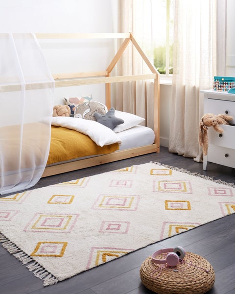 Baumwollteppich mit geometrischem Muster. Dieser handgefertigte getuftete Teppich ist eine gute Wahl, um Ihr Interieur aufzuwerten. Seine neutrale Cremefarbe in Kombination mit dem geometrischen Muster passt zu vielen Einrichtungsstilen und setzt gleichzeitig farbige Akzente. Die Fransen an den Seiten des Teppichs verleihen ihm eine gemütliche Note, die perfekt in Ihr Wohnzimmer passt. Der Teppich besteht aus weicher Baumwolle, die sich angenehm anfühlt. Details: Typ Kurzflor. Farbe: Weiß. Farbton: Cremeweiß. Material: Stoff. Material: Baumwolle. Zusammenstellung: 100% Baumwolle. Form: Rechteckig. Rutschfeste Unterseite: Nein. Stoffgewicht: 1500 g/m2. Muster: Geometrisches Muster. Herstellungsmethode: Handgetuftet. Abmessungen: Florhöhe: 1 cm. Breite: 140 cm. Länge: 200 cm. Gewicht: 3.3 kg. .Sie kaufen: 1 x Teppich. Produktvorteile: Handgefertigt mit viel Liebe zum Detail, Geeignet für Fussbodenheizung, Wunderbar geeignet für Schlaf- und Wohnbereich, Nur für Innenräume geeignet, Unterschiedliche Aufstellungsmöglichkeiten. Montage: Benötigt keine Montage. Zusatzinformationen: Herstellungstechnik: Beim Handtuftverfahren wird das Garn mit einer speziellen Nadel in das Trägermaterial des Teppichs eingestochen. Dabei wird das Garn nicht so fest in das Trägermaterial eingearbeitet wie bei anderen Methoden (z.B. Webteppiche). Daher können sich manchmal einzelne Fäden lösen. Pflegeanleitung: 1.Staubsaugen einmal pro Woche ist ausreichend, um den Teppich sauber und gepflegt zu halten. Wir empfehlen dazu einen Staubsauger mit flacher, weicher Bürste und die Einstellung von mittlerer Saugleistung. Saugen Sie Ihren Teppich immer in Florrichtung ab. 2.Soweit das Format dies zulässt, drehen Sie den Teppich alle sechs Monate um 180 Grad. So erhalten sie eine gleichmäßige Abnutzung und vermeiden Sie Verbleichen der Farben durch Sonneneinstrahlung. 3.Entfernen Sie Flecken umgehend. Flüssigkeiten werden mit einem saugfähigen, nicht färbenden Baumwolltuch aufgenommen. Arbeiten Sie vom Rand nach innen und verreiben Sie den Fleck nicht. 4.Bei festem Schmutz können Sie die losen Schmutzteile vorsichtig abkratzen. Danach wird die Stelle mit klarem, lauwarmem Wasser abgetupft. Benutzen Sie dazu ein sauberes nicht färbendes Baumwolltuch sowie einen Fleckentferner speziell für Teppiche. Bitte befeuchten Sie den Teppich dabei nicht zu stark. Falls der Fleck hartnäckig sein sollte, wenden Sie sich bitte an ein Fachgeschäft für Teppichreinigungen. 5.Es wird empfohlen den ausgepackten Teppich mindestens ein paar Stunden (am besten ein oder zwei Tage) zu lüften. Dies ermöglicht den natürlichen Geruch des Materials, aus dem das Produkt gefertigt wurde, zu mildern.