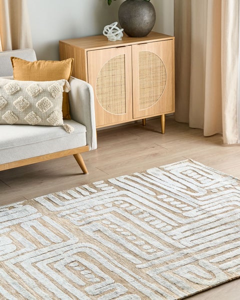 Rechteckiger Teppich mit modernem Design. Dieser beigefarbene Teppich ist ein stilvolles Designerstück für moderne Wohnräume, die sowohl Komfort als auch Stil vermitteln. Mit seinem strukturierten, geometrischen Muster strahlt er eine schlichte, aber charmante Ausstrahlung aus, die sich leicht in verschiedene Einrichtungsstile einfügen lässt. Dank seiner lockeren, gemütlichen Note verleiht er jedem Raum eine ungezwungene Eleganz. Details: Typ Kurzflor. Farbe: Beige. Farbton: Hellgrau. Material: Stoff. Material: Wolle. Rückseitenmaterial: Baumwolle. Zusammenstellung: 100% Polyester. Form: Rechteckig. Rutschfeste Unterseite: Ja. Stoffgewicht: 2600 g/m2. Muster: Streifenmuster. Abmessungen: Florhöhe: 1.5 cm. Breite: 160 cm. Länge: 230 cm. Gewicht: 10 kg. .Sie kaufen: 1 x Teppich. Produktvorteile: Geeignet für Fussbodenheizung, Besonders sicher dank rutschfester Unterseite, Minimalistischer, skandinavischer Stil, Erzeugt Wohlfühlcharakter in jedem Raum, Wunderbar geeignet für Schlaf- und Wohnbereich, Hohe Qualität. Montage: Benötigt keine Montage. Zusatzinformationen: Der Artikel könnte Haare verlieren. Dies ist ein normaler Vorgang und stellt keinen Qualitätsmangel des Produkts dar. Der Artikel benötigt einige Zeit, bis er seinen ursprünglichen Zustand erreicht hat – daher sollte er so schnell wie möglich ausgerollt werden und innerhalb von 72 Stunden seine vollständige Größe wieder erreichen. Für einen optimalen Effekt sollte man die Teppichkanten mit schweren Gegenständen fixieren. Pflegeanleitung: 1.Staubsaugen einmal pro Woche ist ausreichend, um den Teppich sauber und gepflegt zu halten. Wir empfehlen dazu einen Staubsauger mit flacher, weicher Bürste und die Einstellung von mittlerer Saugleistung. Saugen Sie Ihren Teppich immer in Florrichtung ab. 2.Soweit das Format dies zulässt, drehen Sie den Teppich alle sechs Monate um 180 Grad. So erhalten sie eine gleichmäßige Abnutzung und vermeiden Sie Verbleichen der Farben durch Sonneneinstrahlung. 3.Entfernen Sie Flecken umgehend. Flüssigkeiten werden mit einem saugfähigen, nicht färbenden Baumwolltuch aufgenommen. Arbeiten Sie vom Rand nach innen und verreiben Sie den Fleck nicht. 4.Bei festem Schmutz können Sie die losen Schmutzteile vorsichtig abkratzen. Danach wird die Stelle mit klarem, lauwarmem Wasser abgetupft. Benutzen Sie dazu ein sauberes nicht färbendes Baumwolltuch sowie einen Fleckentferner speziell für Teppiche. Bitte befeuchten Sie den Teppich dabei nicht zu stark. Falls der Fleck hartnäckig sein sollte, wenden Sie sich bitte an ein Fachgeschäft für Teppichreinigungen. 5.Es wird empfohlen den ausgepackten Teppich mindestens ein paar Stunden (am besten ein oder zwei Tage) zu lüften. Dies ermöglicht den natürlichen Geruch des Materials, aus dem das Produkt gefertigt wurde, zu mildern.