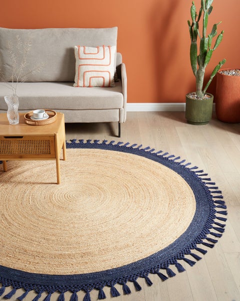 Handgefertigter Flachgewebeteppich. Mit diesem runden Juteteppich verleihen Sie Ihrem Zuhause eine ganz besondere Note. Er bringt Wärme und Charakter in jeden Raum. Aus einer Mischung von Jute und Baumwolle sorgfältig von Hand gewebt, ist er langlebig und von hoher Qualität. Die aufwendige Webstruktur und die natürlichen Farbtöne des Teppichs schaffen eine harmonische Verschmelzung von traditioneller und Boho-Ästhetik. Details: Typ Geflochtener Teppich. Stil: Boho. Farbe: Beige. Farbton: Dunkelblau. Material: Stoff. Material: Jute. Zusätzliches Material: Baumwolle. Zusammenstellung: 80% Jute. Form: Rund. Rutschfeste Unterseite: Nein. Stoffgewicht: 2000 g/m2. Muster: Ohne Muster. Herstellungsmethode: Handgewebt. Abmessungen: Florhöhe: 0.5 cm. Breite: 200 cm. Länge: 200 cm. Gewicht: 7.5 kg. .Sie kaufen: 1 x Teppich. Produktvorteile: Handgefertigt mit viel Liebe zum Detail, Wunderbar geeignet für Schlaf- und Wohnbereich, Handgefertigtes Flechtwerk betont den einzigartigen Charakter, Besonders pflegeleicht und langlebig, Hochwertiges Material. Montage: Benötigt keine Montage. Zusatzinformationen: Da der Teppich handgewebt ist, können kleine Farb-, Muster-, bzw. Grössendifferenzen auftreten. Diese Unterschiede stellen jedoch keinen Produktfehler dar. Der Artikel benötigt einige Zeit, bis er seinen ursprünglichen Zustand erreicht hat – daher sollte er so schnell wie möglich ausgerollt werden und innerhalb von 72 Stunden seine vollständige Größe wieder erreichen. Für einen optimalen Effekt sollte man die Teppichkanten mit schweren Gegenständen fixieren. Bitte beachten Sie, dass jedes Modell leicht von dem im Bild dargestellten abweichen kann. Die Anordnung der Farben und Muster kann unterschiedlich ausfallen und wird nicht als Produktfehler, sondern als Merkmal betrachtet Pflegeanleitung: 1.Staubsaugen einmal pro Woche ist ausreichend, um den Teppich sauber und gepflegt zu halten. Wir empfehlen dazu einen Staubsauger mit flacher, weicher Bürste und die Einstellung von mittlerer Saugleistung. Saugen Sie Ihren Teppich immer in Florrichtung ab. 2.Soweit das Format dies zulässt, drehen Sie den Teppich alle sechs Monate um 180 Grad. So erhalten sie eine gleichmäßige Abnutzung und vermeiden Sie Verbleichen der Farben durch Sonneneinstrahlung. 3.Entfernen Sie Flecken umgehend. Flüssigkeiten werden mit einem saugfähigen, nicht färbenden Baumwolltuch aufgenommen. Arbeiten Sie vom Rand nach innen und verreiben Sie den Fleck nicht. 4.Bei festem Schmutz können Sie die losen Schmutzteile vorsichtig abkratzen. Danach wird die Stelle mit klarem, lauwarmem Wasser abgetupft. Benutzen Sie dazu ein sauberes nicht färbendes Baumwolltuch sowie einen Fleckentferner speziell für Teppiche. Bitte befeuchten Sie den Teppich dabei nicht zu stark. Falls der Fleck hartnäckig sein sollte, wenden Sie sich bitte an ein Fachgeschäft für Teppichreinigungen. 5.Es wird empfohlen den ausgepackten Teppich mindestens ein paar Stunden (am besten ein oder zwei Tage) zu lüften. Dies ermöglicht den natürlichen Geruch des Materials, aus dem das Produkt gefertigt wurde, zu mildern.