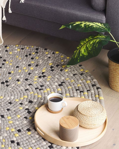 Vielfarbiger, runder Teppich in Patchwork-Optik. Ein Meisterstück der Handarbeit - dieser runde Teppich wurde aus kleinen Wollkugeln, mit Liebe zum Detail gewebt. Seine klassischen Farben, in Schwarz, Grau und Gelb machen ihn zum perfekten Begleiter neben einem Sofa, Sessel oder Schaukelstuhl. Kuschelig weich unter den Füßen und dabei auch noch sehr dekorativ. Details: Typ Kurzflor. Farbe: Grau. Farbton: Hellgrau. Material: Stoff. Material: Wolle. Zusammenstellung: 100% Wolle. Form: Rund. Rutschfeste Unterseite: Nein. Stoffgewicht: 4500 g/m2. Muster: Abstraktes Muster. Herstellungsmethode: Handgemacht. Abmessungen: Florhöhe: 3 cm. Breite: 140 cm. Länge: 140 cm. Gewicht: 9 kg. .Sie kaufen: 1 x Teppich. Produktvorteile: Geeignet für Fussbodenheizung, Trendy Farben und Design, Passt wunderbar zu jedem Einrichtungsstil, Handgefertigte Präzision, Besonders pflegeleicht und langlebig. Montage: Benötigt keine Montage. Zusatzinformationen: Der Artikel könnte Haare verlieren. Dies ist ein normaler Vorgang und stellt keinen Qualitätsmangel des Produkts dar. Da der Teppich handgewebt ist, können kleine Farb-, Muster-, bzw. Grössendifferenzen auftreten. Diese Unterschiede stellen jedoch keinen Produktfehler dar. Der Artikel benötigt einige Zeit, bis er seinen ursprünglichen Zustand erreicht hat – daher sollte er so schnell wie möglich ausgerollt werden und innerhalb von 72 Stunden seine vollständige Größe wieder erreichen. Für einen optimalen Effekt sollte man die Teppichkanten mit schweren Gegenständen fixieren. Pflegeanleitung: 1.Staubsaugen einmal pro Woche ist ausreichend, um den Teppich sauber und gepflegt zu halten. Wir empfehlen dazu einen Staubsauger mit flacher, weicher Bürste und die Einstellung von mittlerer Saugleistung. Saugen Sie Ihren Teppich immer in Florrichtung ab. 2.Soweit das Format dies zulässt, drehen Sie den Teppich alle sechs Monate um 180 Grad. So erhalten sie eine gleichmäßige Abnutzung und vermeiden Sie Verbleichen der Farben durch Sonneneinstrahlung. 3.Entfernen Sie Flecken umgehend. Flüssigkeiten werden mit einem saugfähigen, nicht färbenden Baumwolltuch aufgenommen. Arbeiten Sie vom Rand nach innen und verreiben Sie den Fleck nicht. 4.Bei festem Schmutz können Sie die losen Schmutzteile vorsichtig abkratzen. Danach wird die Stelle mit klarem, lauwarmem Wasser abgetupft. Benutzen Sie dazu ein sauberes nicht färbendes Baumwolltuch sowie einen Fleckentferner speziell für Teppiche. Bitte befeuchten Sie den Teppich dabei nicht zu stark. Falls der Fleck hartnäckig sein sollte, wenden Sie sich bitte an ein Fachgeschäft für Teppichreinigungen. 5.Es wird empfohlen den ausgepackten Teppich mindestens ein paar Stunden (am besten ein oder zwei Tage) zu lüften. Dies ermöglicht den natürlichen Geruch des Materials, aus dem das Produkt gefertigt wurde, zu mildern.