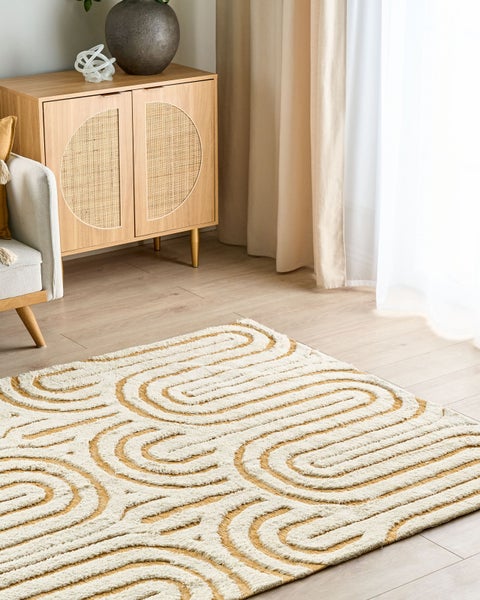 Rechteckiger Teppich mit modernem Design. Dieser große Teppich bringt mit seiner einzigartigen Farbkombination und dem auffälligen Muster ein modernes Flair in Ihren Alltag. Er ist aus Baumwolle und Polyester gefertigt, fühlt sich angenehm weich an und ist langlebig. Die einfache Pflege sorgt für eine lange Lebensdauer und macht ihn zu einer idealen Ergänzung für Wohn- oder Schlafzimmer. Dank der verwendeten Materialien kann dieser Teppich auch in Räumen mit Fußbodenheizung verwendet werden. Details: Typ Kurzflor. Farbe: Weiß. Farbton: Cremeweiß. Material: Stoff. Material: Baumwolle. Zusätzliches Material: Polyester. Rückseitenmaterial: Baumwolle. Zusammenstellung: 10% Polyester. Form: Rechteckig. Rutschfeste Unterseite: Nein. Stoffgewicht: 1300 g/m2. Muster: Abstraktes Muster. Herstellungsmethode: Maschinengewebt. Abmessungen: Florhöhe: 1 cm. Breite: 160 cm. Länge: 230 cm. Gewicht: 10 kg. .Sie kaufen: 1 x Teppich. Produktvorteile: Geeignet für Fussbodenheizung, Herrlich weich, Modernes Design, Besonders pflegeleicht und langlebig, Hochwertiges Material. Montage: Benötigt keine Montage. Zusatzinformationen: Der Artikel benötigt einige Zeit, bis er seinen ursprünglichen Zustand erreicht hat – daher sollte er so schnell wie möglich ausgerollt werden und innerhalb von 72 Stunden seine vollständige Größe wieder erreichen. Für einen optimalen Effekt sollte man die Teppichkanten mit schweren Gegenständen fixieren. Pflegeanleitung: 1.Staubsaugen einmal pro Woche ist ausreichend, um den Teppich sauber und gepflegt zu halten. Wir empfehlen dazu einen Staubsauger mit flacher, weicher Bürste und die Einstellung von mittlerer Saugleistung. Saugen Sie Ihren Teppich immer in Florrichtung ab. 2.Soweit das Format dies zulässt, drehen Sie den Teppich alle sechs Monate um 180 Grad. So erhalten sie eine gleichmäßige Abnutzung und vermeiden Sie Verbleichen der Farben durch Sonneneinstrahlung. 3.Entfernen Sie Flecken umgehend. Flüssigkeiten werden mit einem saugfähigen, nicht färbenden Baumwolltuch aufgenommen. Arbeiten Sie vom Rand nach innen und verreiben Sie den Fleck nicht. 4.Bei festem Schmutz können Sie die losen Schmutzteile vorsichtig abkratzen. Danach wird die Stelle mit klarem, lauwarmem Wasser abgetupft. Benutzen Sie dazu ein sauberes nicht färbendes Baumwolltuch sowie einen Fleckentferner speziell für Teppiche. Bitte befeuchten Sie den Teppich dabei nicht zu stark. Falls der Fleck hartnäckig sein sollte, wenden Sie sich bitte an ein Fachgeschäft für Teppichreinigungen. 5.Es wird empfohlen den ausgepackten Teppich mindestens ein paar Stunden (am besten ein oder zwei Tage) zu lüften. Dies ermöglicht den natürlichen Geruch des Materials, aus dem das Produkt gefertigt wurde, zu mildern.