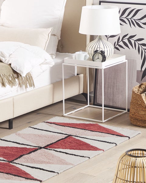 Teppich mit geometrischem Muster. Dieser Flächenteppich aus Baumwolle ist eine wunderbare Ergänzung für jeden Wohnraum im Retro- oder minimalistischen Stil. Der Flor besteht aus weicher Baumwolle, die sich durch ihre Langlebigkeit und Strapazierfähigkeit auszeichnet. Sein geometrisches Muster in Beige, Rosa und Rot passt perfekt in jedes Wohnzimmer, Schlafzimmer oder jeden Flur. Das Wohnaccessoire enthält eine Baumwollunterlage und ist daher für Fußbodenheizungen geeignet. Details: Typ Kurzflor. Farbe: Bunt. Farbton: Hellbeige. Material: Stoff. Material: Baumwolle. Rückseitenmaterial: Baumwolle. Zusammenstellung: 100% Baumwolle. Form: Rechteckig. Rutschfeste Unterseite: Nein. Stoffgewicht: 2500 g/m2. Muster: Geometrisches Muster. Herstellungsmethode: Getuftet. Abmessungen: Florhöhe: 1 cm. Breite: 80 cm. Länge: 150 cm. Gewicht: 3 kg. .Sie kaufen: 1 x Teppich. Produktvorteile: Geeignet für Fussbodenheizung, Gut kombinierbar mit vielen Einrichtungsstilen, Retro Stil, Ansprechende Farbkombination, Hochwertiges Material. Montage: Benötigt keine Montage. Zusatzinformationen: Der Artikel könnte Haare verlieren. Dies ist ein normaler Vorgang und stellt keinen Qualitätsmangel des Produkts dar. Pflegeanleitung: 1.Staubsaugen einmal pro Woche ist ausreichend, um den Teppich sauber und gepflegt zu halten. Wir empfehlen dazu einen Staubsauger mit flacher, weicher Bürste und die Einstellung von mittlerer Saugleistung. Saugen Sie Ihren Teppich immer in Florrichtung ab. 2.Soweit das Format dies zulässt, drehen Sie den Teppich alle sechs Monate um 180 Grad. So erhalten sie eine gleichmäßige Abnutzung und vermeiden Sie Verbleichen der Farben durch Sonneneinstrahlung. 3.Entfernen Sie Flecken umgehend. Flüssigkeiten werden mit einem saugfähigen, nicht färbenden Baumwolltuch aufgenommen. Arbeiten Sie vom Rand nach innen und verreiben Sie den Fleck nicht. 4.Bei festem Schmutz können Sie die losen Schmutzteile vorsichtig abkratzen. Danach wird die Stelle mit klarem, lauwarmem Wasser abgetupft. Benutzen Sie dazu ein sauberes nicht färbendes Baumwolltuch sowie einen Fleckentferner speziell für Teppiche. Bitte befeuchten Sie den Teppich dabei nicht zu stark. Falls der Fleck hartnäckig sein sollte, wenden Sie sich bitte an ein Fachgeschäft für Teppichreinigungen. 5.Es wird empfohlen den ausgepackten Teppich mindestens ein paar Stunden (am besten ein oder zwei Tage) zu lüften. Dies ermöglicht den natürlichen Geruch des Materials, aus dem das Produkt gefertigt wurde, zu mildern.