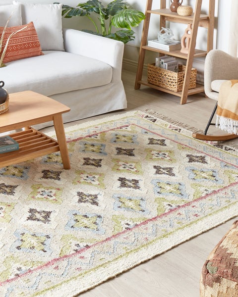 Handgewebter Boho-Teppich in Beige mit Fransen. Dieser Teppich ist die perfekte Ergänzung für jedes klassische Zuhause oder für Wohnräume im Boho-Stil. Er wurde aus strapazierfähiger Jute handgewebt und ist daher sehr langlebig. Der Teppich hat ein mehrfarbiges orientalisches Muster und beigefarbene dekorative Quasten. Aus diesem Grund passt er gut in ein Schlafzimmer oder Wohnzimmer und setzt einen weichen und neutralen Akzent in jedem Raum. Details: Typ Geflochtener Teppich. Stil: Boho. Farbe: Bunt. Material: Stoff. Material: Jute. Zusätzliches Material: Baumwolle. Zusammenstellung: 80% Jute. Form: Rechteckig. Rutschfeste Unterseite: Nein. Stoffgewicht: 1450 g/m2. Muster: Orientalisches Muster. Geeignet für Fußbodenheizung: Ja. Herstellungsmethode: Handgewebt. Abmessungen: Florhöhe: 1 cm. Breite: 140 cm. Länge: 200 cm. Gewicht: 5 kg. .Sie kaufen: 1 x Teppich. Produktvorteile: Handgefertigt mit viel Liebe zum Detail, Wunderbar geeignet für Schlaf- und Wohnbereich, Gemütliche Ausstrahlung, Elegantes Design, Hohe Qualität. Montage: Benötigt keine Montage. Zusatzinformationen: Da der Teppich handgewebt ist, können kleine Farb-, Muster-, bzw. Grössendifferenzen auftreten. Diese Unterschiede stellen jedoch keinen Produktfehler dar. Der Artikel benötigt einige Zeit, bis er seinen ursprünglichen Zustand erreicht hat – daher sollte er so schnell wie möglich ausgerollt werden und innerhalb von 72 Stunden seine vollständige Größe wieder erreichen. Für einen optimalen Effekt sollte man die Teppichkanten mit schweren Gegenständen fixieren. Pflegeanleitung: Jute: 1.Soweit das Format dies zulässt, drehen Sie den Teppich alle sechs Monate um 180 Grad. So erhalten sie eine gleichmäßige Abnutzung und vermeiden Sie Verbleichen der Farben durch Sonneneinstrahlung. 2.Bei festem Schmutz können Sie die losen Schmutzteile vorsichtig abkratzen. Danach wird die Stelle mit klarem, lauwarmem Wasser abgetupft. Benutzen Sie dazu ein sauberes nicht färbendes Baumwolltuch sowie einen Fleckentferner speziell für Teppiche. Bitte befeuchten Sie den Teppich dabei nicht zu stark. Falls der Fleck hartnäckig sein sollte, wenden Sie sich bitte an ein Fachgeschäft für Teppichreinigungen. 3.Staubsaugen einmal pro Woche ist ausreichend, um den Teppich sauber und gepflegt zu halten. Wir empfehlen dazu einen Staubsauger mit flacher, weicher Bürste und die Einstellung von mittlerer Saugleistung. Saugen Sie Ihren Teppich immer in Florrichtung ab. 4.Es wird empfohlen den ausgepackten Teppich mindestens ein paar Stunden (am besten ein oder zwei Tage) zu lüften. Dies ermöglicht den natürlichen Geruch des Materials, aus dem das Produkt gefertigt wurde, zu mildern, 5.Entfernen Sie Flecken umgehend. Flüssigkeiten werden mit einem saugfähigen, nicht färbenden Baumwolltuch aufgenommen. Arbeiten Sie vom Rand nach innen und verreiben Sie den Fleck nicht.