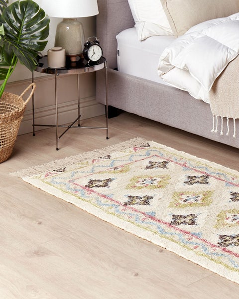 Handgewebter Boho-Teppich in Beige mit Fransen. Dieser Teppich ist die perfekte Ergänzung für jedes klassische Zuhause oder für Wohnräume im Boho-Stil. Er wurde aus strapazierfähiger Jute handgewebt und ist daher sehr langlebig. Der Teppich hat ein mehrfarbiges orientalisches Muster und beigefarbene dekorative Quasten. Aus diesem Grund passt er gut in ein Schlafzimmer oder Wohnzimmer und setzt einen weichen und neutralen Akzent in jedem Raum. Details: Typ Geflochtener Teppich. Farbe: Bunt. Material: Stoff. Material: Jute. Zusätzliches Material: Baumwolle. Zusammenstellung: 80% Jute. Form: Rechteckig. Rutschfeste Unterseite: Nein. Stoffgewicht: 1450 g/m2. Muster: Orientalisches Muster. Herstellungsmethode: Handgewebt. Abmessungen: Florhöhe: 1 cm. Breite: 80 cm. Länge: 150 cm. Gewicht: 2 kg. .Sie kaufen: 1 x Teppich. Produktvorteile: Handgefertigt mit viel Liebe zum Detail, Geeignet für Fussbodenheizung, Wunderbar geeignet für Schlaf- und Wohnbereich, Gemütliche Ausstrahlung, Hohe Qualität. Montage: Benötigt keine Montage. Zusatzinformationen: Da der Teppich handgewebt ist, können kleine Farb-, Muster-, bzw. Grössendifferenzen auftreten. Diese Unterschiede stellen jedoch keinen Produktfehler dar. Der Artikel benötigt einige Zeit, bis er seinen ursprünglichen Zustand erreicht hat – daher sollte er so schnell wie möglich ausgerollt werden und innerhalb von 72 Stunden seine vollständige Größe wieder erreichen. Für einen optimalen Effekt sollte man die Teppichkanten mit schweren Gegenständen fixieren. Pflegeanleitung: 1.Staubsaugen einmal pro Woche ist ausreichend, um den Teppich sauber und gepflegt zu halten. Wir empfehlen dazu einen Staubsauger mit flacher, weicher Bürste und die Einstellung von mittlerer Saugleistung. Saugen Sie Ihren Teppich immer in Florrichtung ab. 2.Soweit das Format dies zulässt, drehen Sie den Teppich alle sechs Monate um 180 Grad. So erhalten sie eine gleichmäßige Abnutzung und vermeiden Sie Verbleichen der Farben durch Sonneneinstrahlung. 3.Entfernen Sie Flecken umgehend. Flüssigkeiten werden mit einem saugfähigen, nicht färbenden Baumwolltuch aufgenommen. Arbeiten Sie vom Rand nach innen und verreiben Sie den Fleck nicht. 4.Bei festem Schmutz können Sie die losen Schmutzteile vorsichtig abkratzen. Danach wird die Stelle mit klarem, lauwarmem Wasser abgetupft. Benutzen Sie dazu ein sauberes nicht färbendes Baumwolltuch sowie einen Fleckentferner speziell für Teppiche. Bitte befeuchten Sie den Teppich dabei nicht zu stark. Falls der Fleck hartnäckig sein sollte, wenden Sie sich bitte an ein Fachgeschäft für Teppichreinigungen. 5.Es wird empfohlen den ausgepackten Teppich mindestens ein paar Stunden (am besten ein oder zwei Tage) zu lüften. Dies ermöglicht den natürlichen Geruch des Materials, aus dem das Produkt gefertigt wurde, zu mildern.