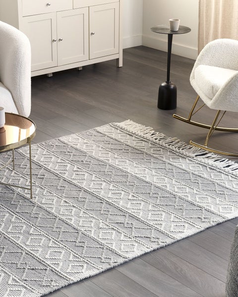 Handgefertigter moderner Teppich mit dekorativen Quasten und geometrischem Muster. Ergänzen Sie Ihr Wohn- oder Schlafzimmer mit diesem klassischen, handgefertigten Teppich. Er ist aus einem strapazierfähigen Woll-Polyester-Gemisch gefertigt, das ihn nicht nur langlebig macht, sondern ihm auch eine angenehm weiche Textur verleiht. Beide Enden des Teppichs sind mit dekorativen Quasten verziert, während die Vorderseite des Wohnaccessoires mit einem auffälligen, geometrischen Muster versehen ist. Details: Typ Kurzflor. Farbe: Grau. Farbton: Cremeweiß. Material: Stoff. Material: Wolle. Zusätzliches Material: Polyester. Rückseitenmaterial: Baumwolle. Zusammenstellung: 55% Wolle. Form: Rechteckig. Rutschfeste Unterseite: Nein. Muster: Geometrisches Muster. Herstellungsmethode: Handgewebt. Abmessungen: Florhöhe: 1 cm. Breite: 160 cm. Länge: 230 cm. Gewicht: 8 kg. .Sie kaufen: 1 x Teppich. Produktvorteile: Geeignet für Fussbodenheizung, Herrlich weich, Ein einzigartiger Hingucker, Passt ausgezeichnet zu vielen Einrichtungsstilen, Pflegeleichtes und strapazierfähiges Material, Handgefertigte Präzision. Montage: Benötigt keine Montage. Zusatzinformationen: Der Artikel benötigt einige Zeit, bis er seinen ursprünglichen Zustand erreicht hat – daher sollte er so schnell wie möglich ausgerollt werden und innerhalb von 72 Stunden seine vollständige Größe wieder erreichen. Für einen optimalen Effekt sollte man die Teppichkanten mit schweren Gegenständen fixieren. Bitte beachten Sie, dass jedes Produkt handgefertigt ist. Abweichungen in Struktur, Farbe oder Form können aufgrund der Eigenschaften der verwendeten Materialien auftreten und stellen keinen Qualitätsmangel dar. Pflegeanleitung: 1.Staubsaugen einmal pro Woche ist ausreichend, um den Teppich sauber und gepflegt zu halten. Wir empfehlen dazu einen Staubsauger mit flacher, weicher Bürste und die Einstellung von mittlerer Saugleistung. Saugen Sie Ihren Teppich immer in Florrichtung ab. 2.Soweit das Format dies zulässt, drehen Sie den Teppich alle sechs Monate um 180 Grad. So erhalten sie eine gleichmäßige Abnutzung und vermeiden Sie Verbleichen der Farben durch Sonneneinstrahlung. 3.Entfernen Sie Flecken umgehend. Flüssigkeiten werden mit einem saugfähigen, nicht färbenden Baumwolltuch aufgenommen. Arbeiten Sie vom Rand nach innen und verreiben Sie den Fleck nicht. 4.Bei festem Schmutz können Sie die losen Schmutzteile vorsichtig abkratzen. Danach wird die Stelle mit klarem, lauwarmem Wasser abgetupft. Benutzen Sie dazu ein sauberes nicht färbendes Baumwolltuch sowie einen Fleckentferner speziell für Teppiche. Bitte befeuchten Sie den Teppich dabei nicht zu stark. Falls der Fleck hartnäckig sein sollte, wenden Sie sich bitte an ein Fachgeschäft für Teppichreinigungen. 5.Es wird empfohlen den ausgepackten Teppich mindestens ein paar Stunden (am besten ein oder zwei Tage) zu lüften. Dies ermöglicht den natürlichen Geruch des Materials, aus dem das Produkt gefertigt wurde, zu mildern.