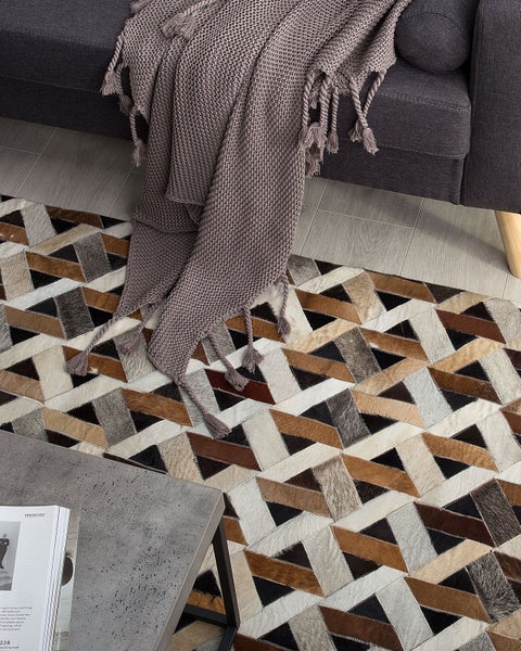 Rechteckiger Lederteppich mit modernem ZickZack Muster. Mit seinem geometrischen Muster in natürlichen Braun-, Grau- und Beigetönen mit zusätzlichen weißen Elementen gehört er zu den schönsten Hinguckern die es gibt. Dieser Teppich passt wundervoll zu rustikalen oder modernen Sofas und bereichert Ihren Wohnraum mit einer großen Portion Wohlgefühl und Wärme. Kombinieren Sie ihn mit verschiedenen Wohnaccessoires, um einen individuellen Effekt zu erzielen. Das hochwertige, weiche Material ist nicht nur angenehm unter den Füßen, es schont den Boden und setzt ihn auch gekonnt in Szene. Details: Typ Kurzflor. Farbe: Braun. Material: Echtleder. Material: Echtleder. Rückseitenmaterial: Filz. Zusammenstellung: 100% Echtleder. Form: Rechteckig. Rutschfeste Unterseite: Nein. Muster: Geometrisches Muster. Herstellungsmethode: Maschinengewebt. Abmessungen: Florhöhe: 1 cm. Breite: 160 cm. Länge: 230 cm. Gewicht: 6 kg. .Sie kaufen: 1 x Teppich. Produktvorteile: Der Filzrücken sorgt für optimalen Komfort und Haltbarkeit, Warme, elegante Farbe, Erzeugt Wohlfühlcharakter in jedem Raum, Klassisches Design, Hohe Qualität. Montage: Benötigt keine Montage. Zusatzinformationen: Der Artikel könnte Haare verlieren. Dies ist ein normaler Vorgang und stellt keinen Qualitätsmangel des Produkts dar. Der Artikel benötigt einige Zeit, bis er seinen ursprünglichen Zustand erreicht hat – daher sollte er so schnell wie möglich ausgerollt werden und innerhalb von 72 Stunden seine vollständige Größe wieder erreichen. Für einen optimalen Effekt sollte man die Teppichkanten mit schweren Gegenständen fixieren. Um die Qualität und Langlebigkeit des Materials zu erhalten, sollten Sie den Teppich nicht in stark beanspruchten Bereichen platzieren. Leder ist ein Naturprodukt. Es kann zu einer Faltenbildung kommen, die durch einen natürlichen Vorgang entsteht. Leder kann sich durch Nutzung ausdehnen und bildet sich nicht komplett zurück in den ursprünglichen Zustand. Farb- und Strukturunterschiede, Narben, Falten und sonstige Naturmerkmale sind Echtheitsbeweise und keine zur Reklamation berechtigende Fehler. Pflegeanleitung: 1.Den Teppich draußen, an der frischen Luft nur leicht mit der Hand auszuklopfen. Legen Sie ihn mit der Oberseite auf ein Baumwolltuch, um ihn dann mit flacher Hand auszuklopfen. Das Ausklopfen mit einem Teppichklopfer ist nicht zu empfehlen, da so das Fell beschädigt werden kann. 2.Regelmäßig mit einer weichen Bürste ausbürsten. Die Bürste sollte speziell für Polstermöbel und Teppiche geeignet sein. 3.Das Absaugen mit einem Staubsauger sollten Sie, wenn möglich, vermeiden, da kleine Härchen ausgerissen werden können. 4.Generell nicht zu empfehlen ist die Verwendung von herkömmlichen Reinigungs- und Lösungsmitteln. Falls der Fleck hartnäckig sein sollte, wenden Sie sich bitte an ein Fachgeschäft für Teppichreinigungen. 5.Wenn der Teppich nass wird, lassen Sie ihn an einem nicht zu warmen Ort trocknen. Das Trocknen in Nähe von Wärmequellen kann den Teppich beschädigen. 6.Soweit das Format dies zulässt, drehen Sie den Teppich alle sechs Monate um 180 Grad. So erhalten sie eine gleichmäßige Abnutzung und vermeiden Sie Verbleichen der Farben durch Sonneneinstrahlung. 7.Vermeiden Sie den übermäßigen Gebrauch. Wir empfehlen den Teppich nicht im meistgenutzten Bereich der Wohnung zu legen, um die Lederstruktur nicht zu beschädigen. 8.Es wird empfohlen den ausgepackten Teppich mindestens ein paar Stunden (am besten ein oder zwei Tage) zu lüften. Dies ermöglicht den natürlichen Geruch des Materials, aus dem das Produkt gefertigt wurde, zu mildern.