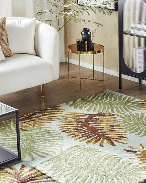 Handgetufteter Kurzflorteppich mit Pflanzenmuster. Setzen Sie auf Naturelemente in Ihrem Zuhause und verschönern Sie Ihren Fußboden mit diesem gemütlichen Kurzhaarteppich, der Sie mit seinem schönen Pflanzenmotiv bestimmt verzaubern wird. Er ist aus hochwertiger Wolle gefertigt, die jahrelangem Gebrauch standhält und die kräftige Textur sowie die frischen Farbtöne beibehält. Das Modell passt perfekt zu Boho- oder rustikalen Räumen, aber auch in traditionelle Einrichtungen, da es dank der Erdtöne eine beruhigende und entspannende Wirkung hat. Wo auch immer Sie sich entscheiden, den Wollteppich zu platzieren, er wird mit Sicherheit den Wohlfühlfaktor Ihres Zimmers steigern. Details: Typ Vintage. Stil: Klassisch. Farbe: Bunt. Farbton: Senfgelb. Material: Stoff. Material: Wolle. Zusätzliches Material: Polyester. Rückseitenmaterial: Polyester. Zusammenstellung: 100% Wolle. Form: Rechteckig. Rutschfeste Unterseite: Nein. Stoffgewicht: 3000 g/m2. Muster: Pflanzenmuster. Geeignet für Fußbodenheizung: Ja. Herstellungsmethode: Handgetuftet. Abmessungen: Florhöhe: 1.5 cm. Breite: 200 cm. Länge: 200 cm. Gewicht: 16 kg. .Sie kaufen: 1 x Teppich. Produktvorteile: Geeignet für Fussbodenheizung, Wunderbar geeignet für Schlaf- und Wohnbereich, Ein einzigartiger Hingucker, Handgefertigte Präzision, Pflegeleichtes und strapazierfähiges Material, Natürliche Materialien. Montage: Benötigt keine Montage. Zusatzinformationen: Der Artikel könnte Haare verlieren. Dies ist ein normaler Vorgang und stellt keinen Qualitätsmangel des Produkts dar. Der Artikel benötigt einige Zeit, bis er seinen ursprünglichen Zustand erreicht hat – daher sollte er so schnell wie möglich ausgerollt werden und innerhalb von 72 Stunden seine vollständige Größe wieder erreichen. Für einen optimalen Effekt sollte man die Teppichkanten mit schweren Gegenständen fixieren. Jeder Artikel ist ein handgefertigtes Unikat; Farbschattierung und Muster können daher vom Foto abweichen. Pflegeanleitung: Wolle: 1.Es wird empfohlen den ausgepackten Teppich mindestens ein paar Stunden (am besten ein oder zwei Tage) zu lüften. Dies ermöglicht den natürlichen Geruch des Materials, aus dem das Produkt gefertigt wurde, zu mildern, 2.Entfernen Sie Flecken umgehend. Flüssigkeiten werden mit einem saugfähigen, nicht färbenden Baumwolltuch aufgenommen. Arbeiten Sie vom Rand nach innen und verreiben Sie den Fleck nicht. 3.Soweit das Format dies zulässt, drehen Sie den Teppich alle sechs Monate um 180 Grad. So erhalten sie eine gleichmäßige Abnutzung und vermeiden Sie Verbleichen der Farben durch Sonneneinstrahlung. 4.Bei festem Schmutz können Sie die losen Schmutzteile vorsichtig abkratzen. Danach wird die Stelle mit klarem, lauwarmem Wasser abgetupft. Benutzen Sie dazu ein sauberes nicht färbendes Baumwolltuch sowie einen Fleckentferner speziell für Teppiche. Bitte befeuchten Sie den Teppich dabei nicht zu stark. Falls der Fleck hartnäckig sein sollte, wenden Sie sich bitte an ein Fachgeschäft für Teppichreinigungen. 5.Staubsaugen einmal pro Woche ist ausreichend, um den Teppich sauber und gepflegt zu halten. Wir empfehlen dazu einen Staubsauger mit flacher, weicher Bürste und die Einstellung von mittlerer Saugleistung. Saugen Sie Ihren Teppich immer in Florrichtung ab.