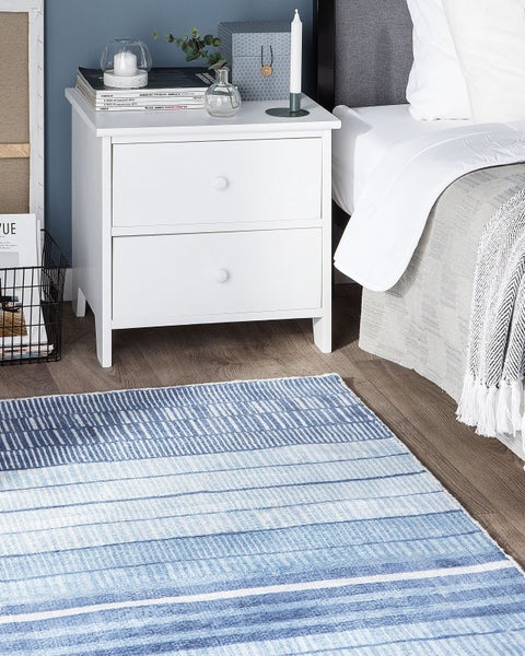Hellblau gestreifter Teppich im Marinestil. Ein schönes Accessoire, das Ihrer Wohnung einen modernen Akzent verleiht. Die verschiedenen Blautöne dieses Teppichs und die unterschiedlich großen Streifen sorgen für ein hübsches Ambiente im Raum und werden vor allem mit anderen Accessoires im Marinestil harmonieren. Der Teppich ist aus Viskose gefertigt und verfügt über eine schonende Unterseite aus Baumwolle. Details: Typ Kurzflor. Farbe: Blau. Farbton: Hellblau. Material: Stoff. Material: Viskose. Rückseitenmaterial: Baumwolle. Zusammenstellung: 100% Viskose. Form: Rechteckig. Rutschfeste Unterseite: Nein. Stoffgewicht: 2400 g/m2. Muster: Streifenmuster. Herstellungsmethode: Handgewebt. Abmessungen: Florhöhe: 1 cm. Breite: 80 cm. Länge: 150 cm. Gewicht: 3 kg. .Sie kaufen: 1 x Teppich. Produktvorteile: Handgefertigt mit viel Liebe zum Detail, Erzeugt Wohlfühlcharakter in jedem Raum, Perfekte Kombination aus Farben und Materialien, Lange Lebensdauer, Moderne Ausstrahlung und langjährige Qualität. Montage: Benötigt keine Montage. Zusatzinformationen: Da der Teppich handgewebt ist, können kleine Farb-, Muster-, bzw. Grössendifferenzen auftreten. Diese Unterschiede stellen jedoch keinen Produktfehler dar. Der Artikel benötigt einige Zeit, bis er seinen ursprünglichen Zustand erreicht hat – daher sollte er so schnell wie möglich ausgerollt werden und innerhalb von 72 Stunden seine vollständige Größe wieder erreichen. Für einen optimalen Effekt sollte man die Teppichkanten mit schweren Gegenständen fixieren. Bitte beachten Sie, dass Viskosefasern eine seidig glänzende Oberfläche haben, die je nach Faserrichtung und Lichtverhältnissen einen andere Farbschattierung annehmen kann. Pflegeanleitung: 1.Staubsaugen einmal pro Woche ist ausreichend, um den Teppich sauber und gepflegt zu halten. Wir empfehlen dazu einen Staubsauger mit flacher, weicher Bürste und die Einstellung von mittlerer Saugleistung. Saugen Sie Ihren Teppich immer in Florrichtung ab. 2.Soweit das Format dies zulässt, drehen Sie den Teppich alle sechs Monate um 180 Grad. So erhalten sie eine gleichmäßige Abnutzung und vermeiden Sie Verbleichen der Farben durch Sonneneinstrahlung. 3.Entfernen Sie Flecken umgehend. Flüssigkeiten werden mit einem saugfähigen, nicht färbenden Baumwolltuch aufgenommen. Arbeiten Sie vom Rand nach innen und verreiben Sie den Fleck nicht. 4.Bei festem Schmutz können Sie die losen Schmutzteile vorsichtig abkratzen. Danach wird die Stelle mit klarem, lauwarmem Wasser abgetupft. Benutzen Sie dazu ein sauberes nicht färbendes Baumwolltuch sowie einen Fleckentferner speziell für Teppiche. Bitte befeuchten Sie den Teppich dabei nicht zu stark. Falls der Fleck hartnäckig sein sollte, wenden Sie sich bitte an ein Fachgeschäft für Teppichreinigungen. 5.Es wird empfohlen den ausgepackten Teppich mindestens ein paar Stunden (am besten ein oder zwei Tage) zu lüften. Dies ermöglicht den natürlichen Geruch des Materials, aus dem das Produkt gefertigt wurde, zu mildern.