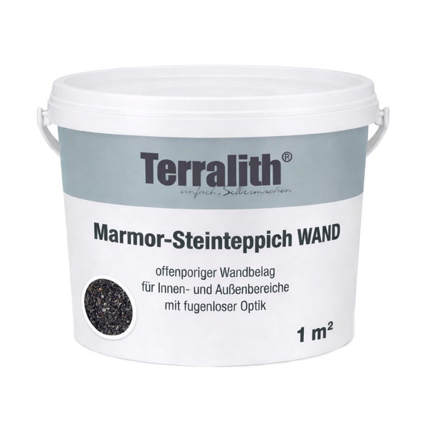 EigenschaftenDer Terralith Steinteppich WAND ist ein offenporiger Wandbelag für den Innen- und Außenbereich mit fugenloser Optik. Die offenporige Struktur wirkt schallschluckend. Die Marmorsteine sind gerundet, farbecht, natürlich und nicht eingefärbt. Das Bindemittel ist 1-komponentig, wasserlöslich und besteht aus einer weißen, standfesten Dispersionsmasse, die nach Trocknung mit den Marmorsteinen matt transparent aushärtet. Der Terralith Steinteppich WAND ist licht- und scheuerbeständig, jedoch nicht für Dauernassbereiche geeignet (z.B. Duschen). Der Terralith Steinteppich WAND ist nur in der Körnung - fein (2-4 mm) erhältlich, weil die gröberen Kornfraktionen an den Wandflächen nicht halten.