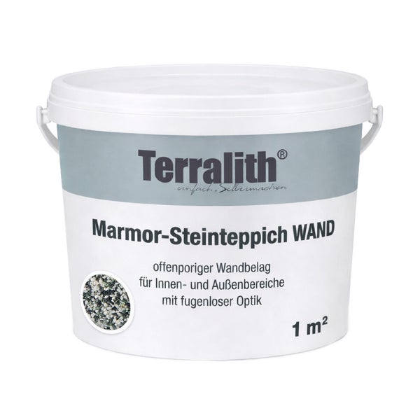 EigenschaftenDer Terralith Steinteppich WAND ist ein offenporiger Wandbelag für den Innen- und Außenbereich mit fugenloser Optik. Die offenporige Struktur wirkt schallschluckend. Die Marmorsteine sind gerundet, farbecht, natürlich und nicht eingefärbt. Das Bindemittel ist 1-komponentig, wasserlöslich und besteht aus einer weißen, standfesten Dispersionsmasse, die nach Trocknung mit den Marmorsteinen matt transparent aushärtet. Der Terralith Steinteppich WAND ist licht- und scheuerbeständig, jedoch nicht für Dauernassbereiche geeignet (z.B. Duschen). Der Terralith Steinteppich WAND ist nur in der Körnung - fein (2-4 mm) erhältlich, weil die gröberen Kornfraktionen an den Wandflächen nicht halten.