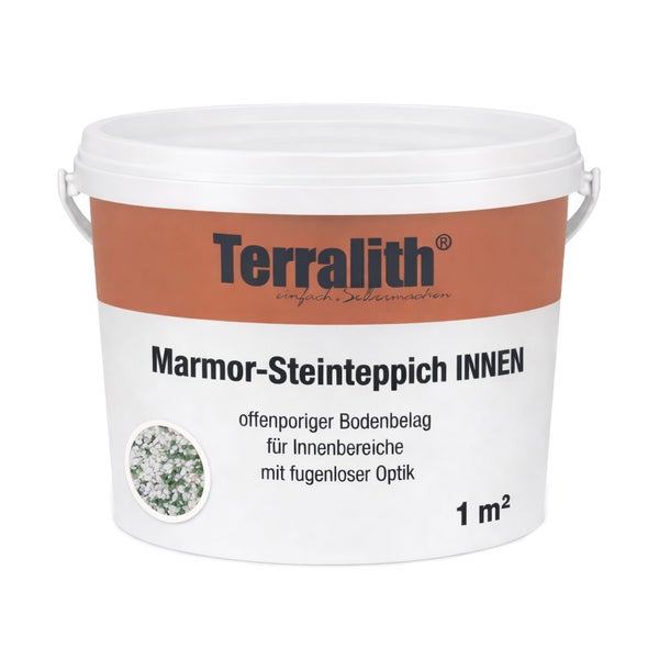 1 m²-Systempakete zur Herstellung von Terralith Steinteppich innen. Es besteht aus entsprechenden Steinen und einem transparenten 2-Komponenten Harz.