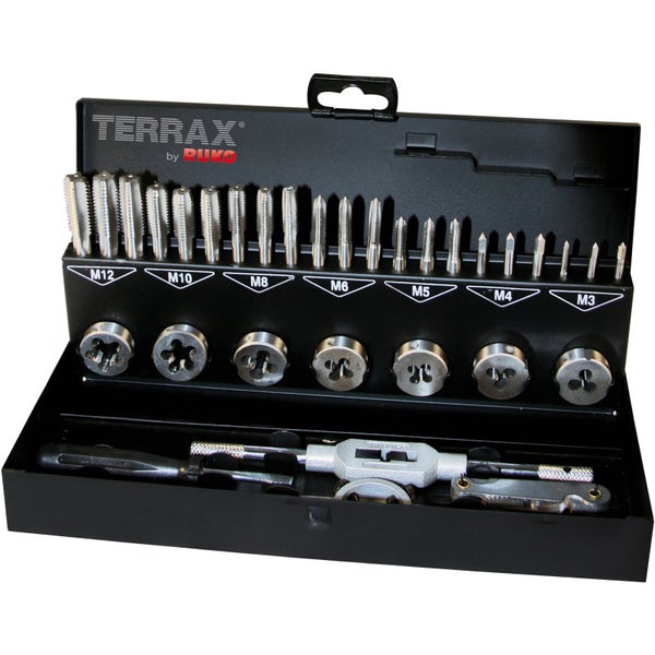 - 1x TERRAX by RUKO Gewindeschneidwerkzeug-Satz 31tlg. HSS in Stahlblechkassette
