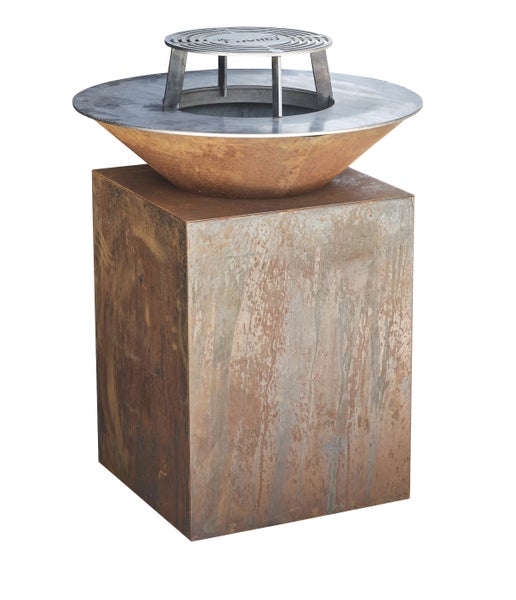 The Favilla FUEGO CORTEN Feuerschale mit Grillring – Outdoor Grill aus Cortenstahl – Feuerstelle mit 3 Temperaturzonen, Holzlager & Grillrost – Design-Grill Ø 85 cm inkl. Abdeckhaube