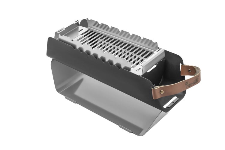 The Favilla FUMO mobiler Holzkohlegrill (48x17x11 cm) in Grau – 2-in-1 Grill mit Edelstahlrost & Spießhalterung – Inkl. Tragetasche für Camping