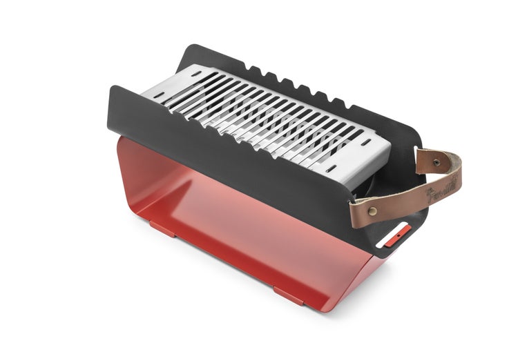 The Favilla FUMO mobiler Holzkohlegrill (48x17x11 cm) in Rot – 2-in-1 Grill mit Edelstahlrost & Spießhalterung – Inkl. Tragetasche für Camping